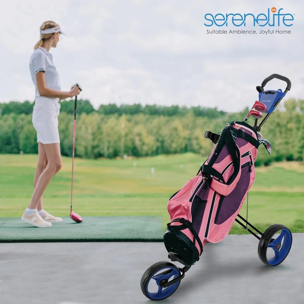 - BALL BEARING WHEELS: SereneLife golf carts push pull golf bag roller carts are equipped w/ two ball bearing wheels that provide balance and easy mobility on the course and traction on all types of terrain for a smooth roll. Rear wheels size is 9.5″