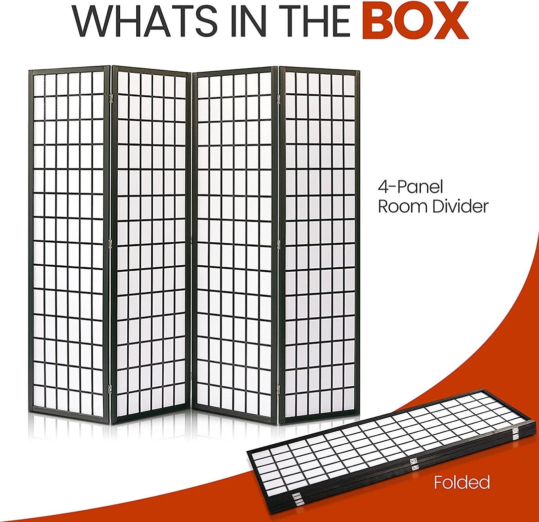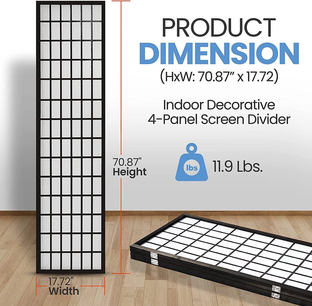 Features: – Classic Japanese-inspired Room Divider – Strong and Durable Hand Crafted Panels – Lightweight, Portable, and Foldable – Easy to Collapse and Unfold – Quick Way to Create Temporary Privacy – Two-way Hinges – Better Privacy Screen – Folding Partition & Wall Divider – Indoor Decorative 4 Panel Screen – Applies for Office, Porch, Living Area to Block Off Sensitive Areas What’s in the Box: – 4-Panel Room Divider Technical Specs: – Construction Materials: Wood and Cloth – No Assembly Needed – Product Dimensions: 70.87” x 17.72” -inches