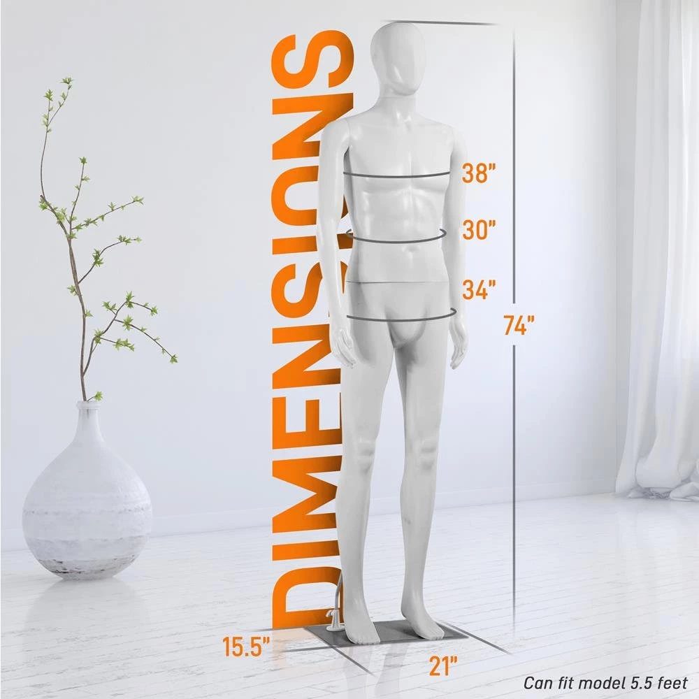 73” Male Mannequin Torso Dress Form – Detachable Mannequin Full Body StandFeatures:• High-Quality PP Material• Shows Vivid Facial Expressions• Detachable and Adjustable Dress Model• Fits All Kinds of Clothes• Durable and Solid Head Metal Base• Easy to Assemble and Disassemble• Not Necessary to Use Any Tools• Head can Turn 360°, Switch to Any Posture• Flexible Hands and Legs• Stable Metal BaseWhat’s in the Box:• Head• Hands• Legs• Trunk• Base• Metal RodTechnical Specs:• Construction Material: Polypropylene (PP)• Chest Size: 38” -inches• Waist Size: 30” -inches• Hip Size: 34” -inches• Total Product Dimension (L x W x H): 15.55” x 21.26” x 74” -inches• Sold as: 1• Weight: 13.49 lbs.