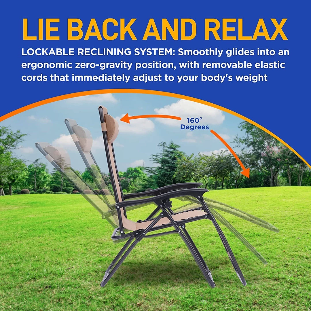 Outdoor Adjustable Zero Gravity Lounge Chair Recliners with Plastic Cup Holder Side Table and Padded Headrest Pillows, 2 Pack, (Cream)