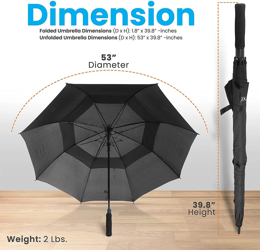 Features: – Design for Storm Day, Quick Dry – Strong Built Frame – Auto Open & Self Handle – Made by High Density 210T Fabric – Non-slip Foam Rubber Handles – Durable Umbrella Bead – Fiberglass Shaft makes it Lightweight, Not Easy to Bend – Eight Ribs Construction – Double Canopy Construction – Windproof and Weatherproof What’s in the Box: – Automatic Open Large Golf Umbrella Technical Specs: – Construction Materials: Impact Cloth – Coverage: Up to 2 Persons – Folded Umbrella Dimensions (D x H): 1.8” x 39.8” -inches – Unfolded Umbrella Dimensions (D x H)): 53” x 39.8” -inches