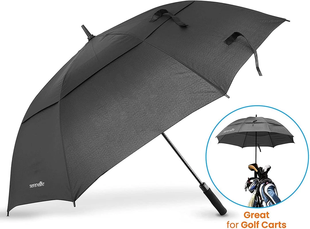 - 62-INCH LARGE: The SereneLife Automatic Golf Umbrella features a 62 inch oversize canopy with comfortable handle grip & sturdy frame. It can protect you from strong wind, heavy downpour or under the sun. It’s big enough for two people when it opens