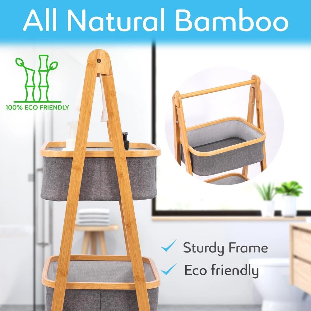 Features: Foldable Basket and Retractable Bamboo Shelf 2 Tier Laundry Basket Cotton Made of Natural Eco-Friendly Bamboo Lightweight, Stable, Durable, and Non-toxic Smooth Surface Finish Countersink Crews Ladder Shape Design Space-Saving Bamboo Shelf Bamboo Shelf Bathroom Rack Organizer What’s in the Box: (2) Laundry Basket (4) Frame Part (1) Round Stick (2) Support Bar (10) Screws (1) screwdriver Technical Specs: Construction Materials: Bamboo, (Hamper: Polyester) Installation Type: Standing Type No. of Tiers: 2 Weight Capacity: 26.45 lbs. Small Laundry Basket Dimensions (L x W x H):15.75” x 12.99” x 5.12” -inches Large Laundry Basket Dimensions (L x W x H):15.75” x 12.99” x 9.06” -inches Folded Dimensions (L x W x H): 38.98” x17.52” x 2.76” -inches (shelf) Unfolded Dimensions (L x W x H): 17.52” x 12.99” x 38.98” -inches (shelf) Sold as: 1 Weight: 8 lbs.