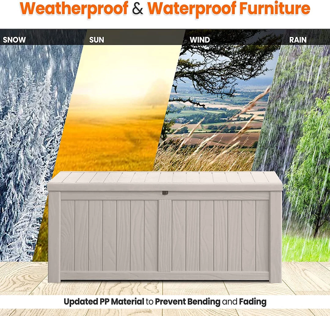 - WEATHERPROOF: This waterproof outdoor storage box furniture is made from durable, long-lasting, and marine-grade PP material making it weatherproof. Built to withstand all weather conditions such as heat, snow, coastal wind, and salt spray