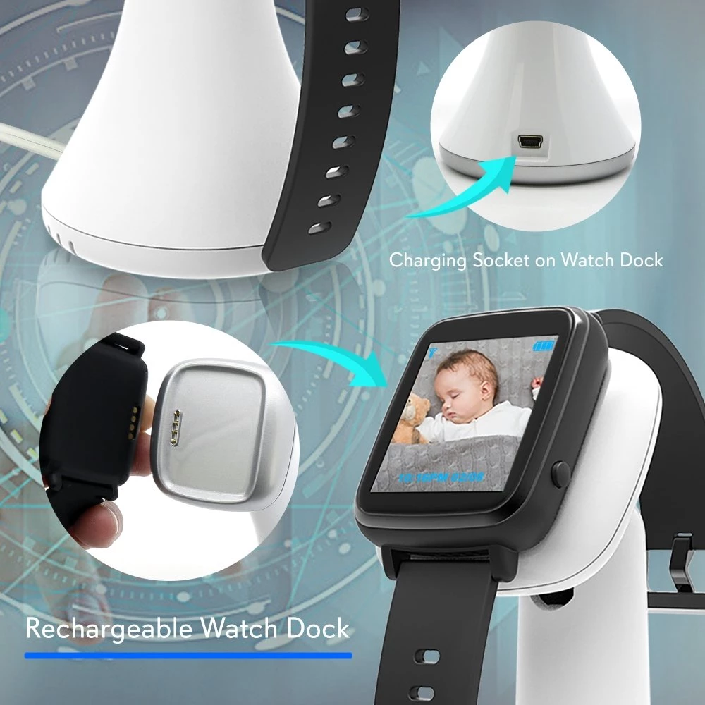 - SMART WATCH MONITOR: The smart baby monitor by SereneLife comes with a black stylish rechargeable video smartwatch with 1.54” inch digital screen that displays video via the mounted camera, PTT voice messaging, time, date, and alarm clock