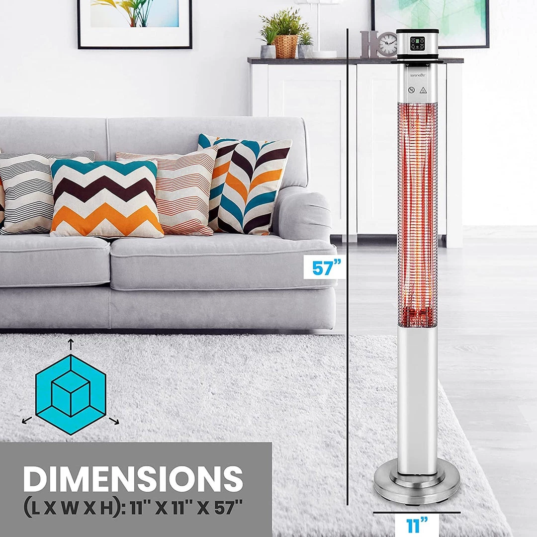 Features: – High Rated Aluminum Reflector – Offers Sun-like Infrared Heating – Includes Mesh Grille Front – Odorless, No Gas or Propane Use – Remote Control Standing Heater – Dust and Waterproof Design – Multi-function Disco Light with Remote Control – Anodized Extruded Aluminum Alloy Housing – High-Efficiency Carbon Fibre Heating Elements – Three Power Settings: Low, Medium, and High – Tip-over Safety Switch – IP44 Approved – Overheat Protection and Quiet Op What’s in the Box: – 1500 Watt Electric Patio Heater – Allen Wrench – (2) M6 x 8-mm Screws – (2) M6 x 27-mm Screws – (2) Screw M4 x 28 Screws – (2) Screw M6 x 35 Screws – (2) Screw M4 x 20 Screws – (1) Camping Board – (1) Cover – (2) Washer – (1) Remote Controller Technical Specs: – Construction Material: Aluminum Alloy Frame, Stainless Steel Base Cover – Power Supply: 1500W – 3 Heat Levels: Low (500 Watts), Medium (1000 Watts), High (1500 Watts) – Heating Area: 25 sq. ft. – Maximum Amperage: 12.5 Amps – Timer: 9 Hours – Battery Life: Up to 2+ Hours – Battery Operated Remote: 1.5V, (2) x ‘AAA’ Batteries (not included) – Power Cable Length: 2 Meters, 120V – Base Cover Size: 11” -inches (Diameter) – Heat Warm Range: Around 10-15 Square Meters – Product Dimensions (L x W x H): 11” x 11” x 57” -inches