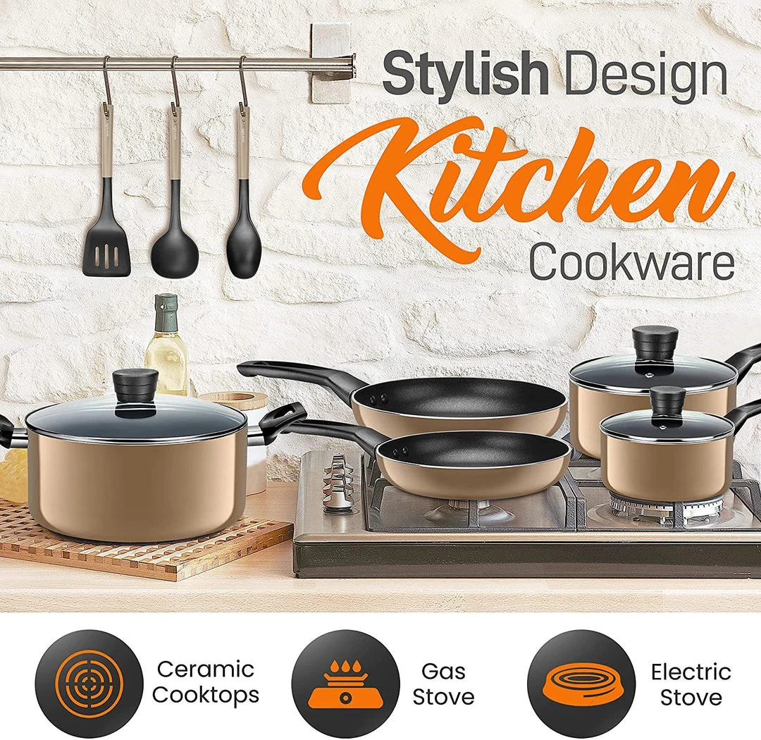 - NON-STICK COATING: The PTFE/PFOA/PFOS-free non stick pot set cooking ware features a long lasting nonstick coating for easy food release or tossing, cleaning & healthy cooking w/ heat resistant lacquer exterior making it resistant to high heat