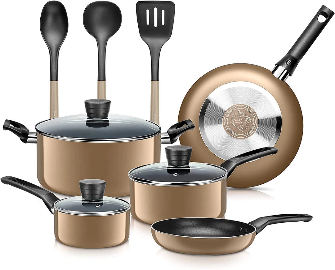 - 11-PIECE SET: The SereneLife Home Basic Kitchen Cookware Set features 11-piece nonstick cookware set which includes 0.89 & 1.90qt sauce pots w/ lids, 4.70qt dutch oven pot w/ lid, 8-inch & 10-inch fry pans, solid spoon, slotted spatula & soup ladle