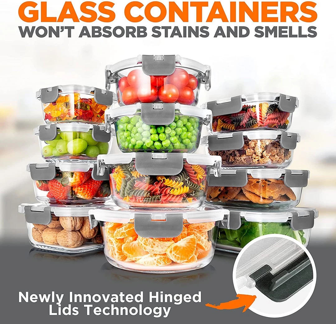 Features: – Containers Tolerate Rapid Temperature Changes without Warping or Cracking – Glass Containers won’t Absorb Stains and Smells – Airtight Seal for Food Freshness – Glossy Surface Maintains the Tastiness of Food for Long Term Use – 100% Leak Proof Glass Meal Prep Containers – Great on-the-go & Freezer to Oven Safe Food Containers – 12 Containers with 12 Lids of Various Sizes – Crafted of High Borosilicate Glass – Safe to Transfer from Freezer to Oven in Instants – Containers are Dishwasher Safe – Friendly to the Environment and Free of Chemicals – Easy to Clean and Store – Lids are Crafted of BPA Free Plastic – Newly Innovated Hinged lids Technology – Hinged Locks with Removable Gasket – Oven, Microwave, Freezer Safe – Stain and Odor Resistant – 4 Snap Airtight, Leak-proof Locking Lid What’s in the Box: – (2) 12 oz with Lid – (1) 21.5 oz with Lid – (1) 35oz with Lid – (2) 11 oz with Lid – (1) 17.5 oz with Lid – (1) 27 oz with Lid – (2) 13.5 oz with Lid – (1) 21.5 oz with Lid – (1) 32 oz with Lid Technical Specs: – Construction Material: High-Quality Glass – Container Style: Rectangle + Square + Round – Lid Style: Hinged Locking Lid – Capacity: 11 Oz – 35 Oz – Temperature: 520? (Max) , -20?(Min) – 12 oz with Lid (L x W x H): 6.22” x 4.68” x 2.20” -inches – 21.5 oz with Lid (L x W x H): 7.16” x 5.43” x 2.48” -inches – 35oz with Lid (L x W x H): 8.19” x 6.22” x 2.72” -inches – 11 oz with Lid (L x W x H): 4.92” x 4.92” x 2.24” -inches – 17.5 oz with Lid (L x W x H): 5.63” x 5.63” x 2.44” -inches – 27 oz with Lid (L x W x H): 6.42” x 6.42” x 2.68” -inches – 13.5 oz with Lid (L x W x H): 5.55” x 5.55” x 2.36” -inches – 21.5 oz with Lid (L x W x H): 6.34” x 6.34” x 2.72” -inches – 32 oz with Lid (L x W x H): 7.20” x 7.20” x 2.91” -inches