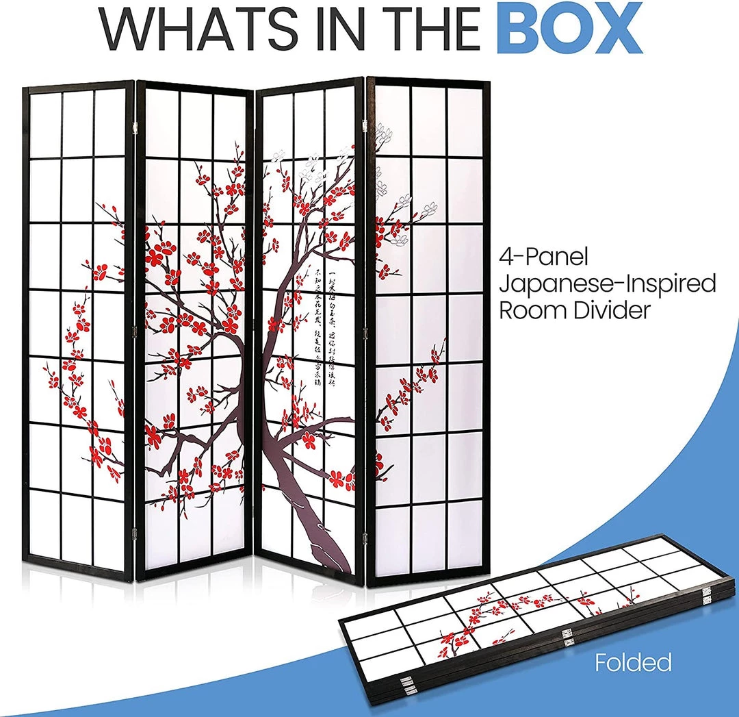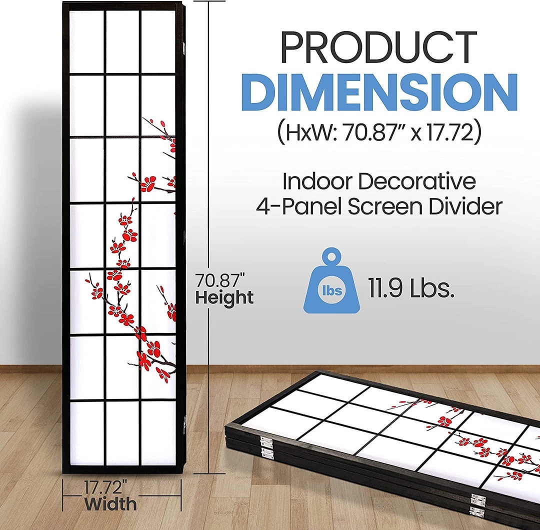 Features: – Classic Japanese-inspired Room Divider – Strong and Durable Hand Crafted Panels – Lightweight, Portable, and Foldable – Easy to Collapse and Unfold – Quick Way to Create Temporary Privacy – Two-way Hinges – Better Privacy Screen – Folding Partition & Wall Divider – Indoor Decorative 4 Panel Screen – Applies for Office, Porch, Living Area to Block Off Sensitive Areas What’s in the Box: – 4-Panel Room Divider Technical Specs: – Construction Materials: Wood and Cloth – No Assembly Needed – Product Dimensions: 70.87” x 17.72” -inches