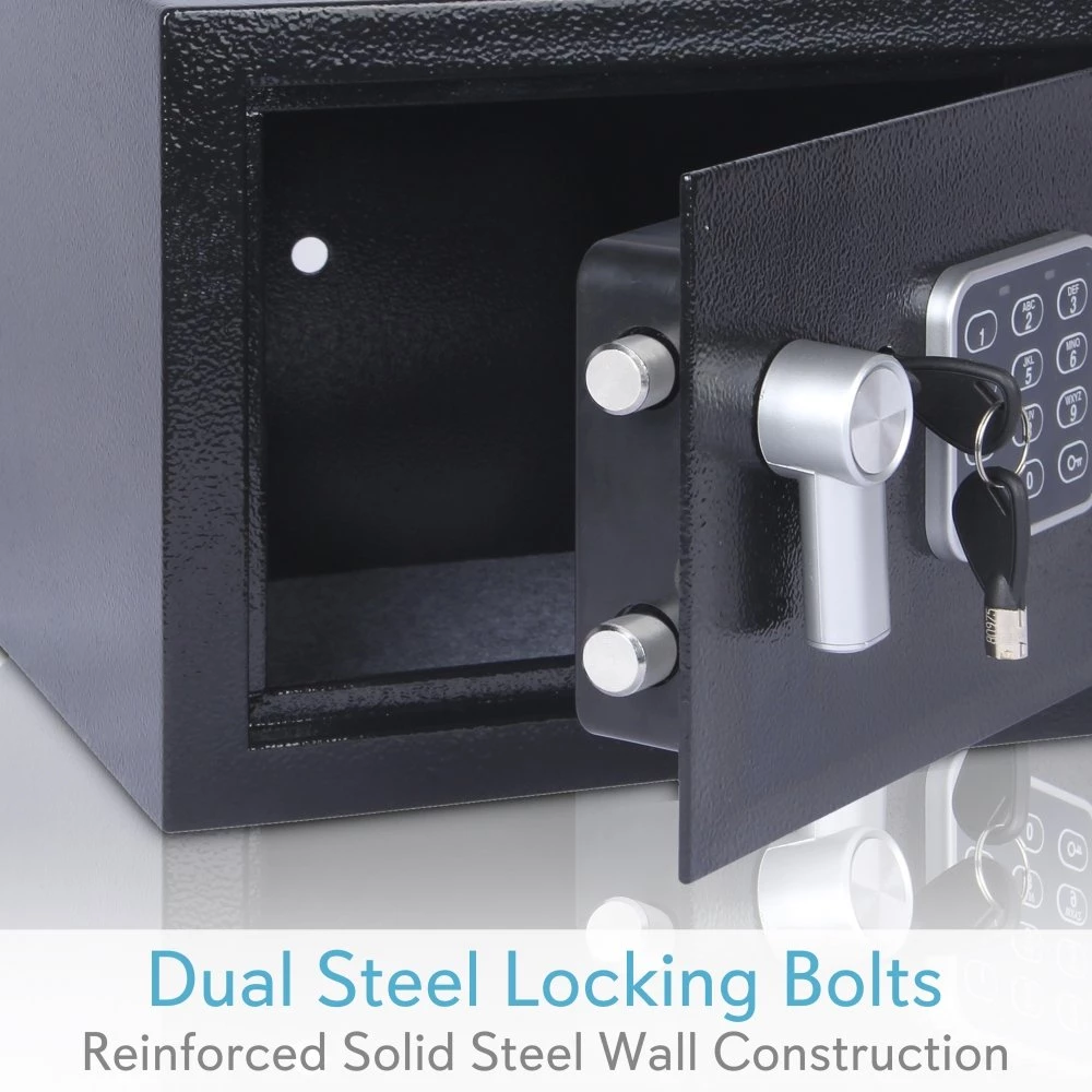 The SereneLife Safe Box will keep your valuables secure & protected. Use the front panel digital button pad to easily control the electronic locking system. Enjoy hassle-free operation and quick access to your belongings after entering your customizable key code. The safe box also allows for manual access with (2) included keys. Additional features include rugged steel alloy construction, dual security steel door locking bolts, corrosion & stain-resistant powder coat finish, along with pre-drilled anchor holes for permanent mounting in a convenient location. Store your valuables and keep them protected with the SereneLife Electronic Safe Box.