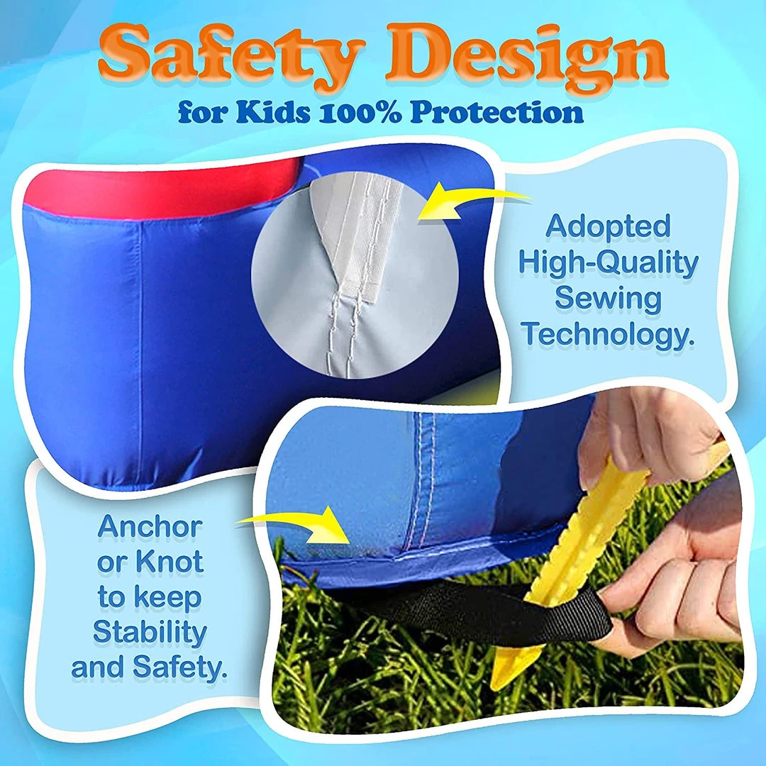 - SAFETY DESIGN: Features a rounded safety opening and surrounded by reinforced net sidewalls to ensure kid’s safety. It also comes with plastic stakes so you can anchor or knot the bounce house to keep it safe & stable. Recommended ages 3 and up