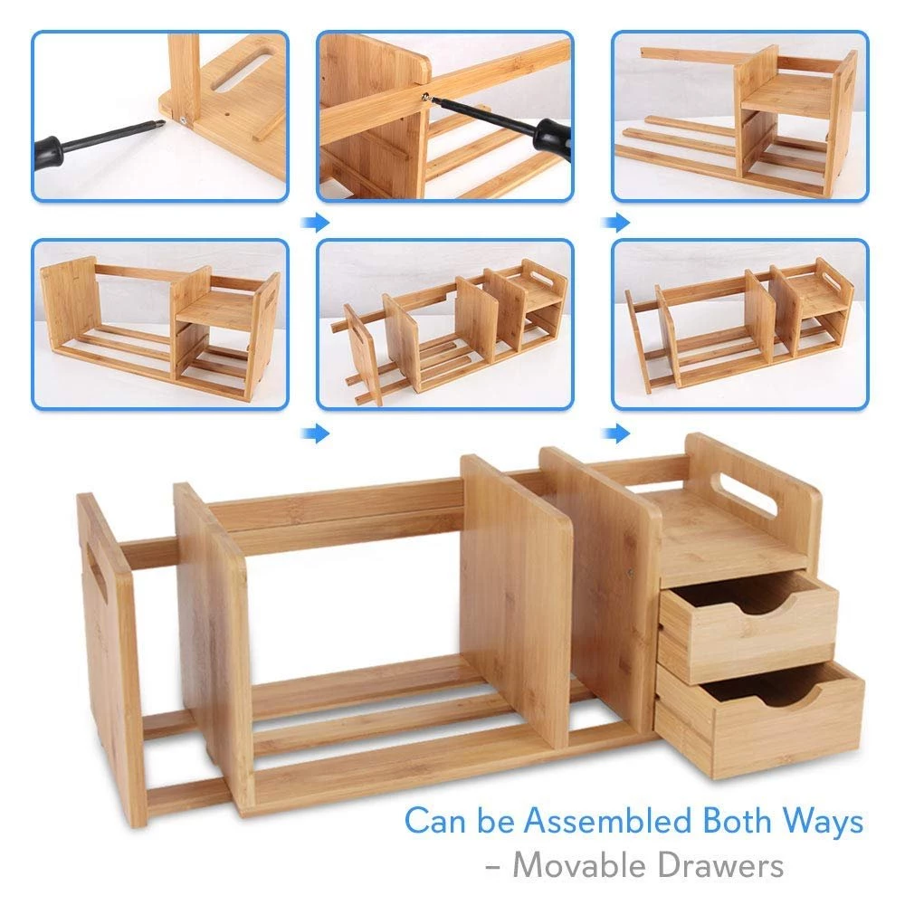 Features: – Desktop Bamboo Shelf – Adjustable / Extending Bookshelf’s – Used for Books, Magazines, Stationary & Office Supplies – (2) Slide-Out Drawers for Extra Storage – Made of Sturdy Compressed Bamboo Bars – Can be Assembled Both Ways -Movable Drawers – Modern & Minimal Style Design Complements Any Desktop – Smooth Rounded Corners for a Classy Look – Lacquer-Coated Bamboo Finish for Long-Lasting Protection – Stain-Resistant & Easy-to-Clean – Perfect for Home, Office or Business Use Technical Specifications: – *Some Assembly Required – Construction Material: Bamboo Wood – Total Closed Size (L x W x H): 20.0’’ x 7.6’’ x 8.3’’ -inches – Total Open / Extended Size (L x W x H): 32.2’’ x 7.6’’ x 8.3’’ -inches