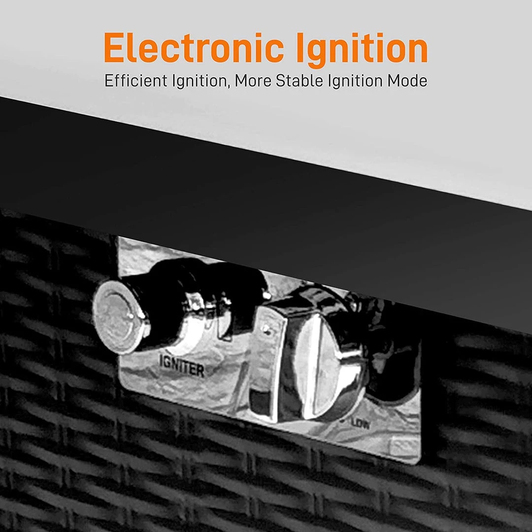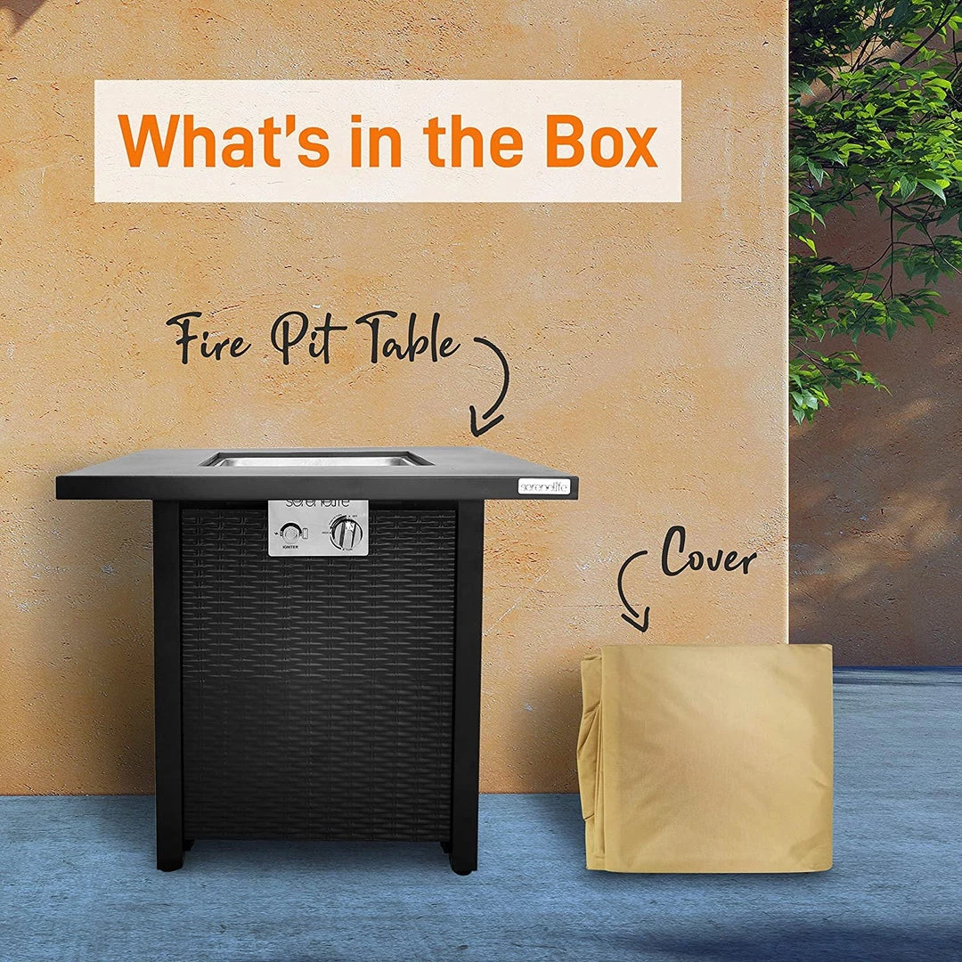 Features: – Not Convertible to Natural Gas – With Fire Pit Cover Lid – Stainless Steel Fire pan – Assembled Gas Hose Regulator – Adjustable Flame Height by Valve Knob – Sturdy Metal Gas Fire Pit Table – Easy to Put Propane Tank, In, and Out – Stainless Steel Control Panel – 40,000 BTU Stainless Steel Burner – Constructs with Weather Resistant – Sturdy Metal for Durability and Long-term Use – Easy to Assemble with Two Persons, Takes 20-30 Minutes – Safe and CSA Certified and Approved – Comes with 1 pc. Independently Metal Table Top and 6.6 lbs. Decorative lave Rock Set – Creates an Elegant Atmosphere in the Garden, Terrace, Balcony or Backyard What’s in the Box: – Steel Tabletop and Panel – Stainless Steel Fire Pan – 201 SS Burner – Copper Injector – Control Knob – Gas Valve – Corrugated Pipe – Pulse Igniter – Thermocouple – Fire Pin with Protective Guard – PVC Cover – Lava Rock – Steel Cover Lid – Battery Technical Specs: – Construction Material: Metal +201 SS Fire Pan – Heat Output: 40,000 BTU – Regulator Valve with Gas Hose Length: 19.7” -inches (500mm) – Metal Cover: Metal and PVC Cover – Primary Fuel Type: Liquid Propane – Propane Tank Weight: 20lbs. (Not Included) – Ignition Type: Pulse – Battery Type: (1) x ‘AA’ Battery (not rechargeable) – Product Dimension (L x W x H): 28” x 28” x 24.5” -inches