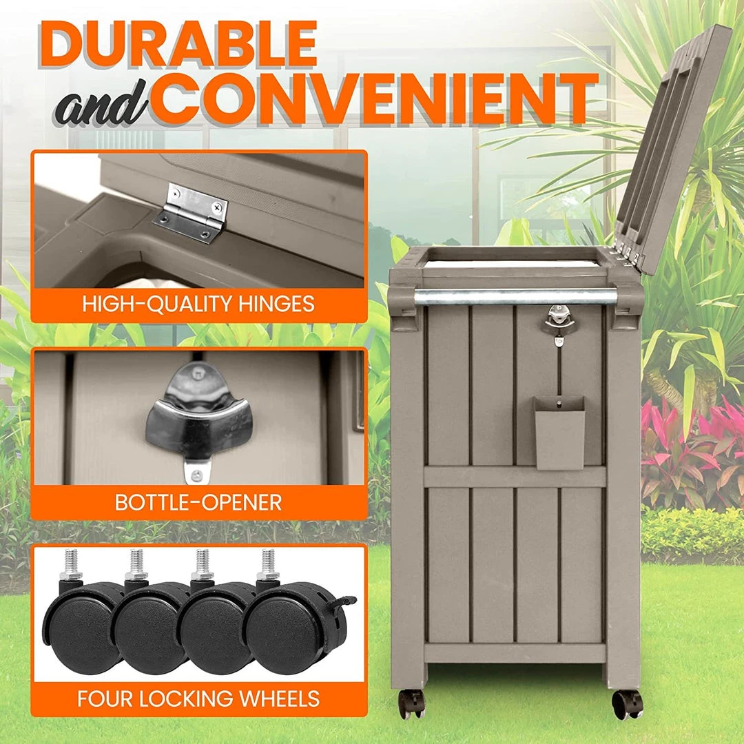 Features: Weatherproof and Waterproof Furniture Durable and Long-lasting Use Lightweight and Easy to Move Marine-grade Quality Hardware Eco-Friendly and Updated PP Material to Prevent Fading 3-in-1 Serving Cart / Storage Table / Prep Station / with 80L ice bucket Weather Resistant Resin with the Appeal of a Natural Wood Texture Convenient, Built-in Bottle Opener Helps Keep the Party Going External Drainage Tube Helps make Cleanup Easy Move Easy with Four Wheels Include Spice Rack Some Assembly Required What’s in the Box: Patio Kitchen Cart Iron Part 304 Screws PVC Bags Technical Specs: Construction Materials: PP Wheel Material: PP Max. Load Capacity: 260 lbs. Assembly Time: 20-25 minutes Overall Dimensions: 39.8” x 18.31” x 34.45” -inches Sold as: 1 Weight: 1 lbs.