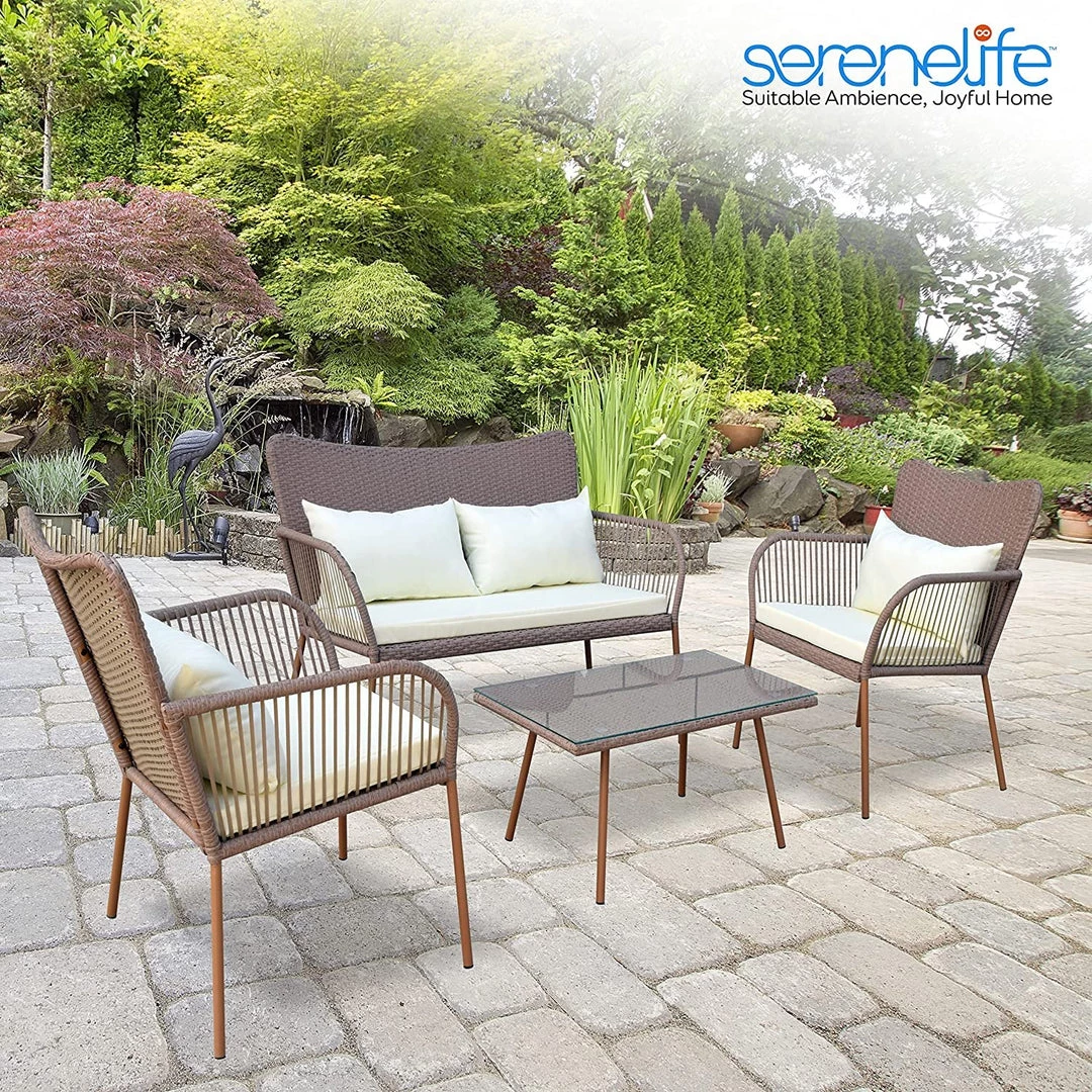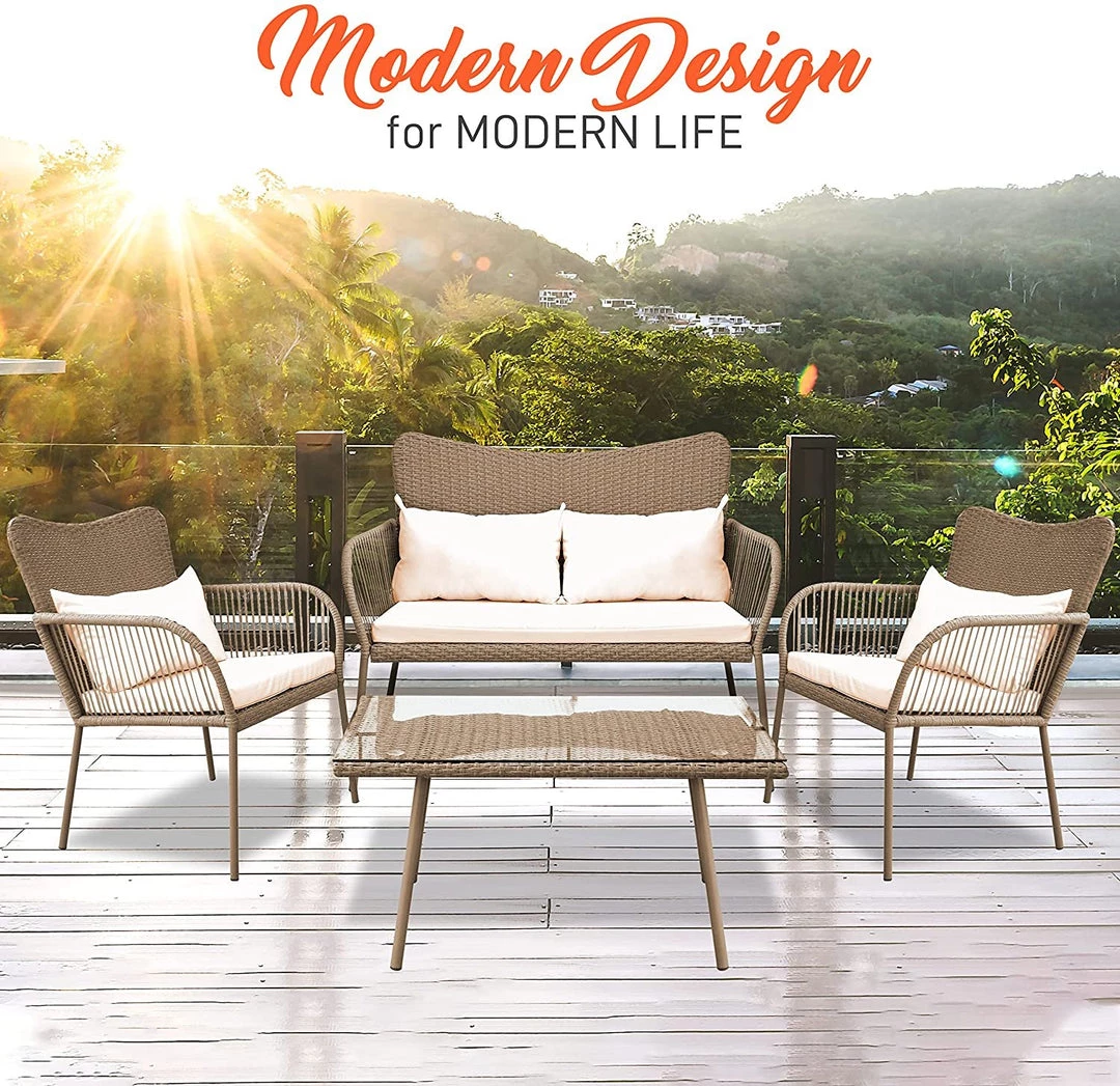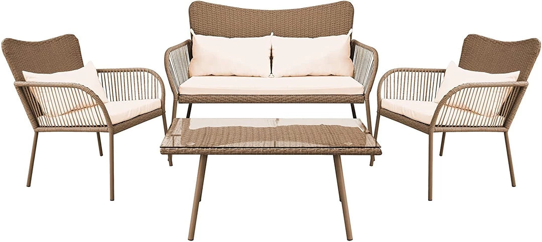 Features: – Easy to Assemble and Move – Modern Design for Modern Life – Soft Cushions for Comfortable Sit – Smooth and Very Relaxing – Anti-rust and Anti-corrosion Treatment for Long Service Life – Durable and Sturdy Rattan Wicker – Easy to Assemble – Tempered Glass Coffee Table – Zipper Designed Cushion Covers for Easy Detachable – Outdoor/Indoor Patio Furniture with Washable Cushions – Comfortable Beige Seat Cushions made with Water-resistant Fabric – Weather-resistant Resin Wicker Rattan – Durable Powder-coated Steel Frame – Double Chair Offers a 500 lbs. Maximum Weight Capacity – Ideal for Patio, Backyard, Porch, Garden, Poolside, Balcony or Pool Side Area What’s in the Box: – (2) Single-Seat Chairs – (1) Double Seat Chair – (1) Glass Coffee Table Technical Specs: – Construction Material: PE Rattan & Steel Frame – Rattan Color: Beige – Cushion: White Polyester Fabric and Sponge Padded – Max. load Capacity: 220 lbs. for one seat – Single Chair (L x W x H): 25.6” x 28” x 33” -inches – Double Chair (L x W x H): 47.3” x 28” x33” -inches – Table (L x W x H): 31.5” x 17.7” x 14.2” -inches – Cushion for Single Chair (W x D): 20” x 18.5” -inches – Cushion for Double Chair (W x D): 20” x 40.2” -inches