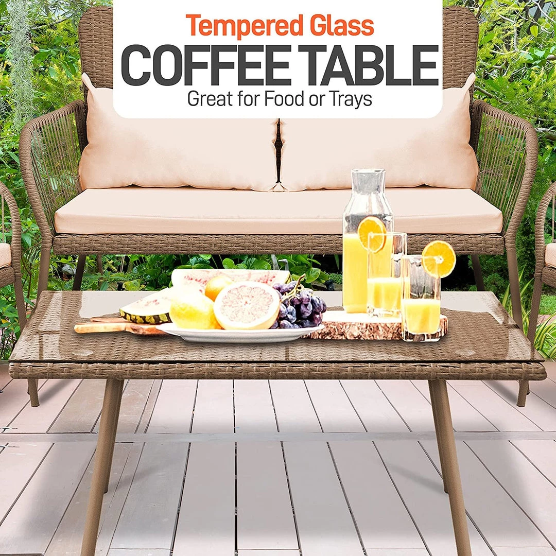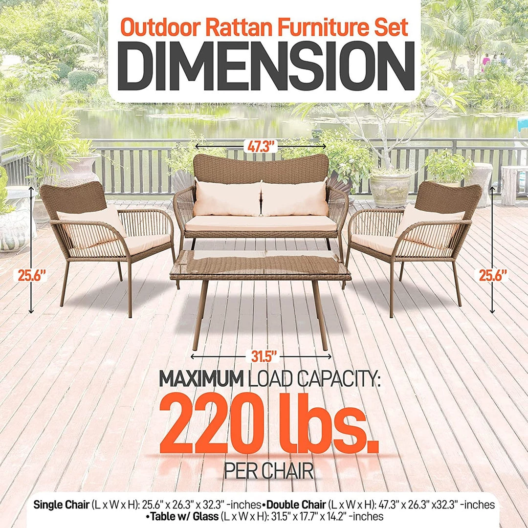 - 4 PIECE RATTAN FURNITURE SET: This rattan set includes 1 love seat (47.3” x 26.3” x32.3”), 2 single chairs with cushion (25.6” x 26.3” x 32.3” each), and 1 glass top coffee table (31.5” x 17.7” x 14.2”)