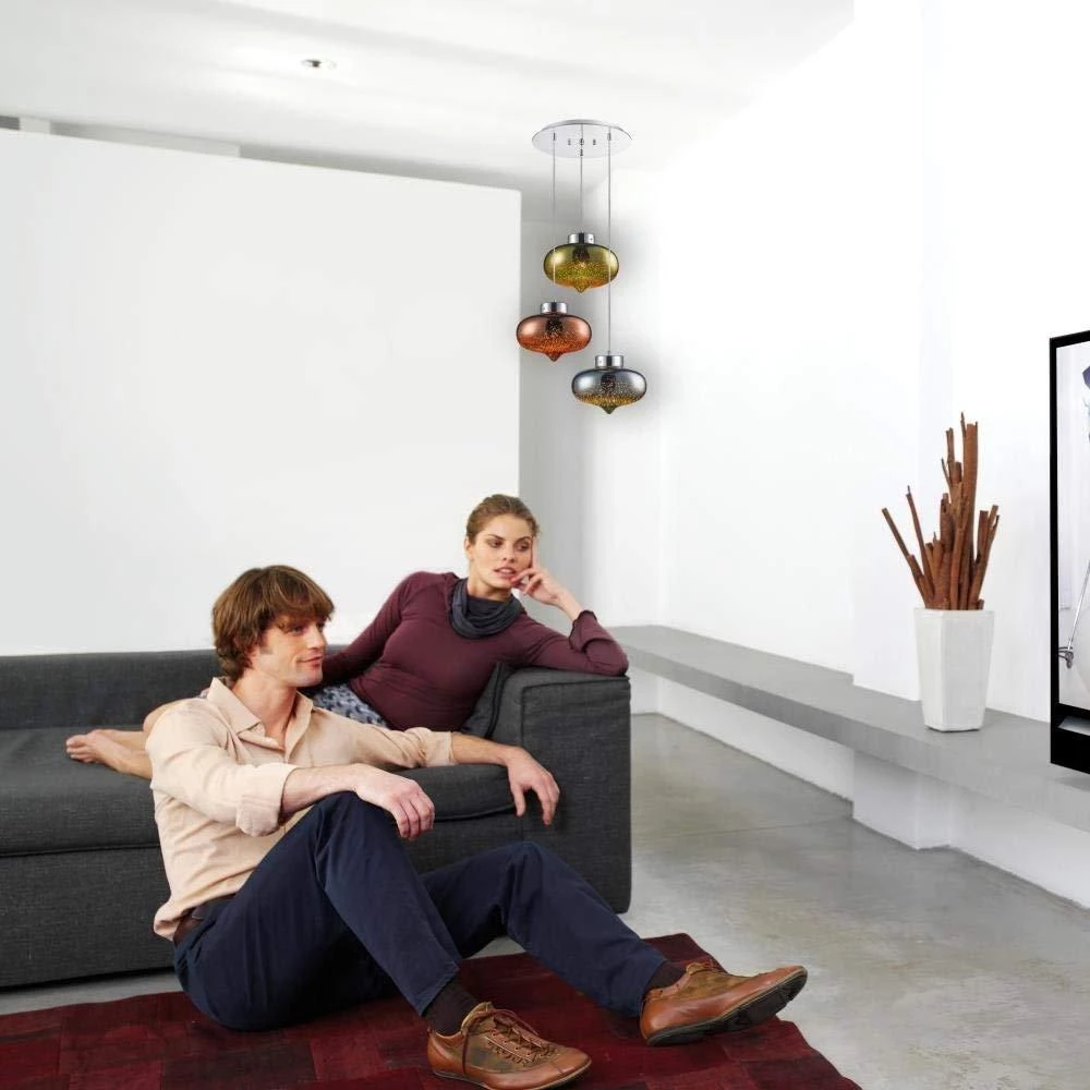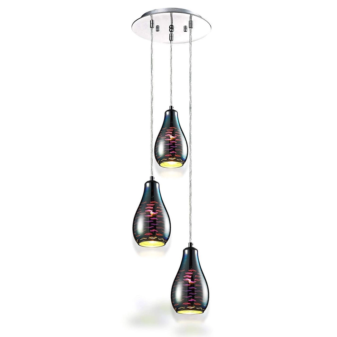 - MODERN DOME DESIGN: A modern home lighting fixture that showcases three dome circular sphere shaped globes. It is a triple hanging pendant lamp with polished chrome plated hardware canopy cover with a subtle 3D art sunburst sculptural effect