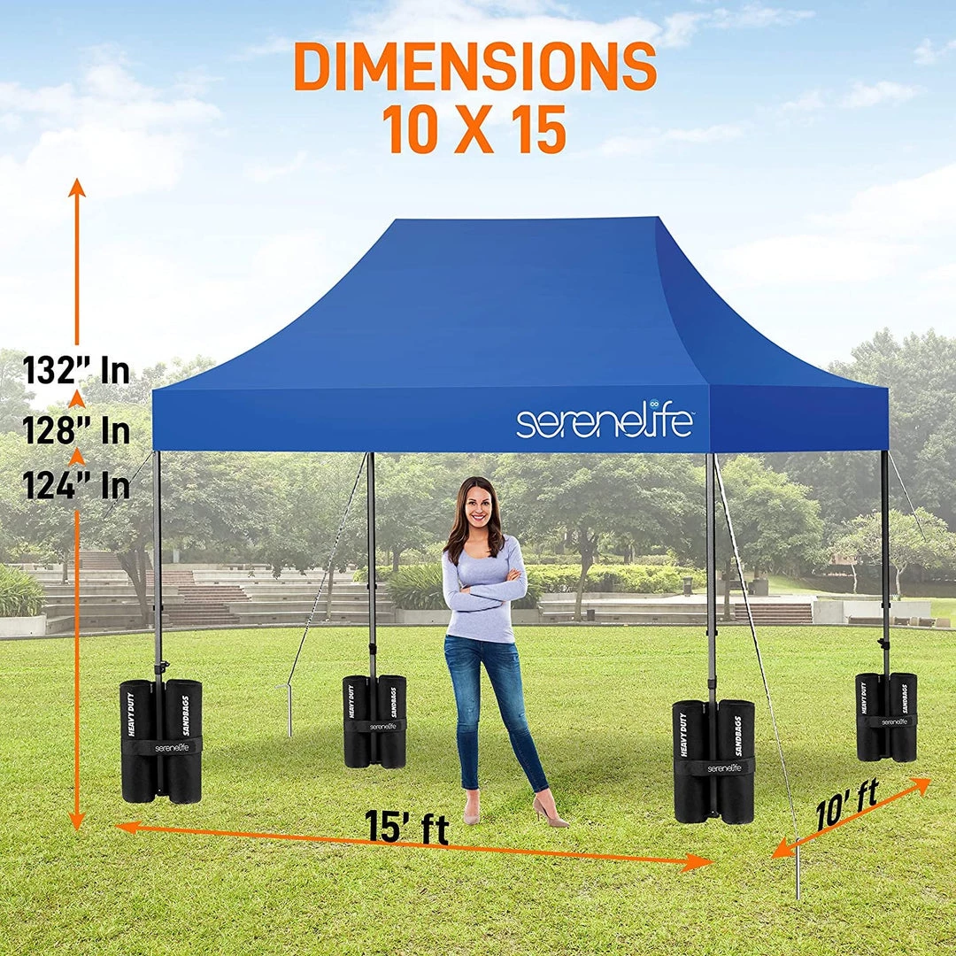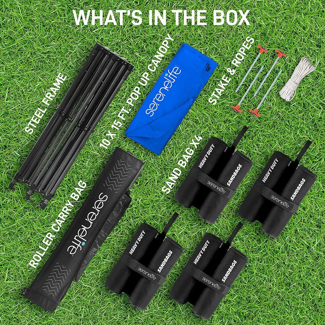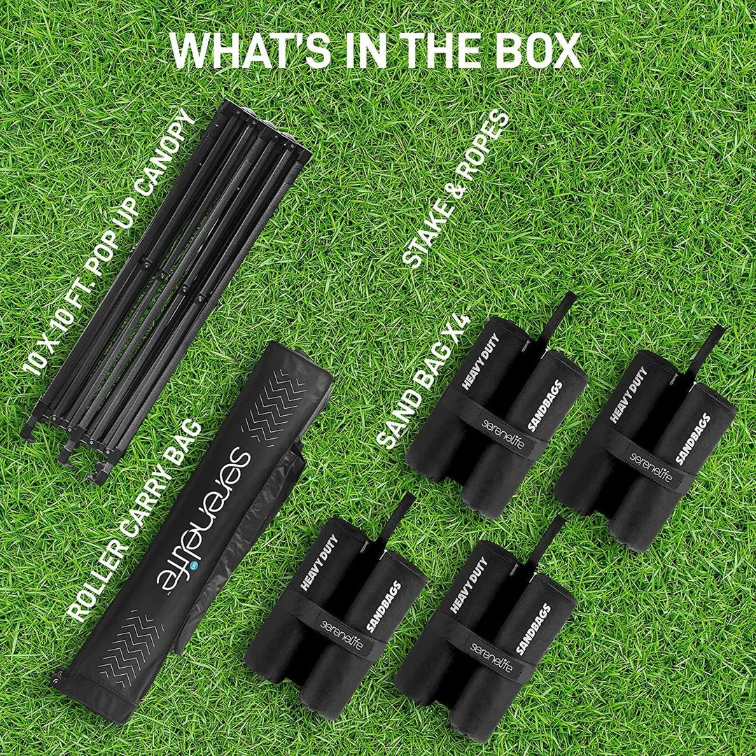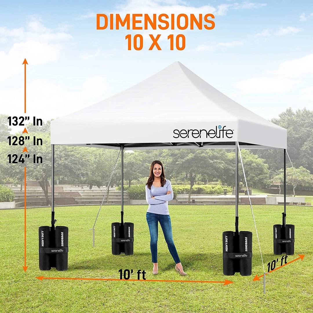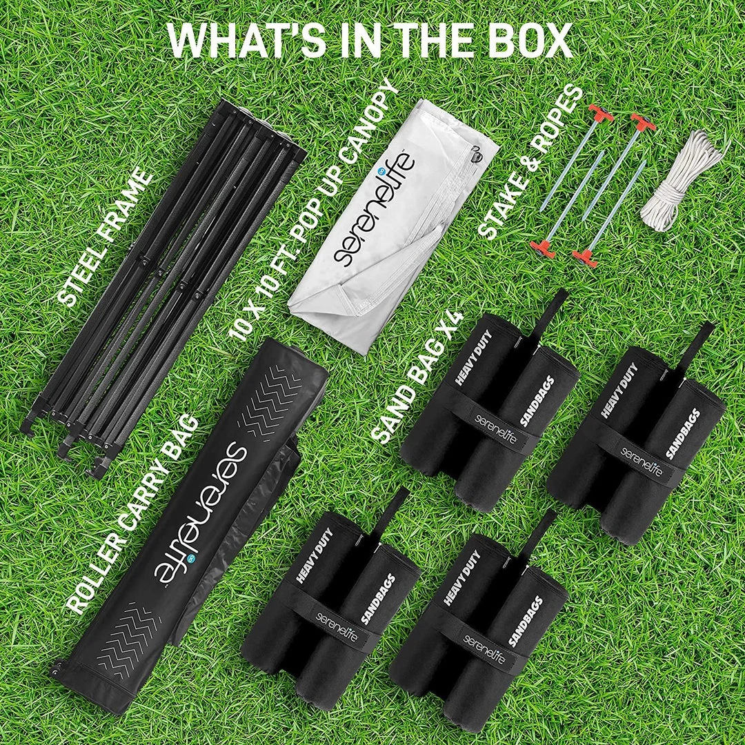 - 100 SQUARE FEET: SereneLife covered tent canopy has a total assembled size of (LxWxH) 120″ x 120″ x 133″ –inches and provides 100 square feet of shade and UV protection. Can cover 4 tables, 3 beach chairs and 10 people at the same time