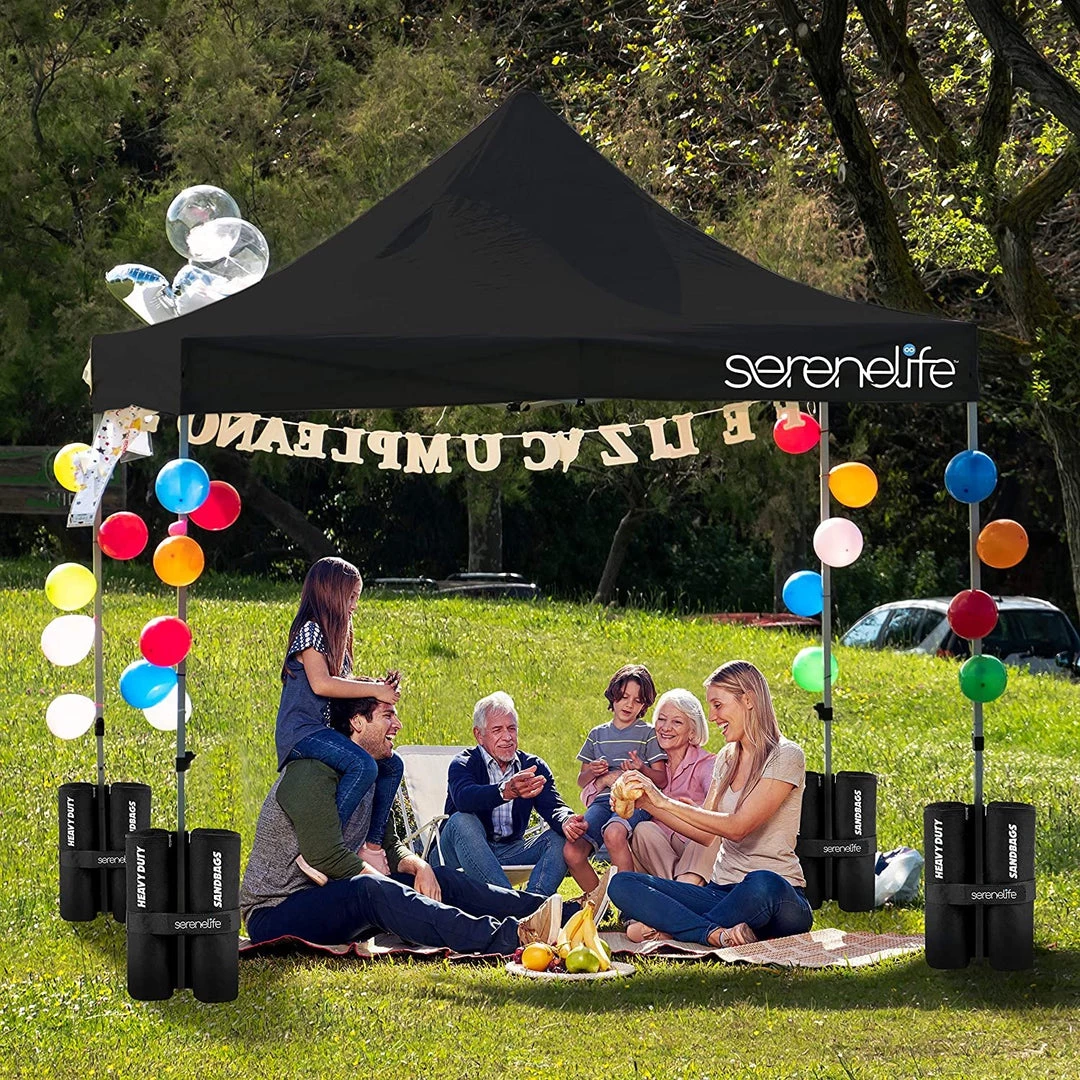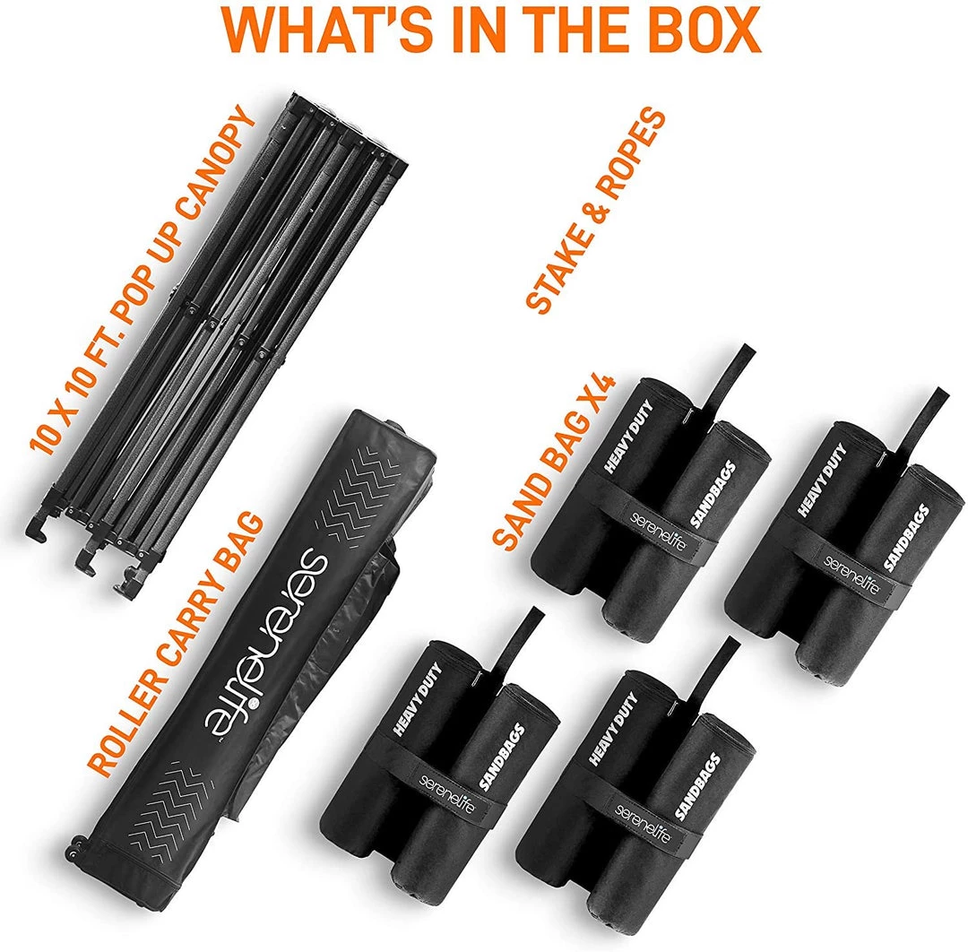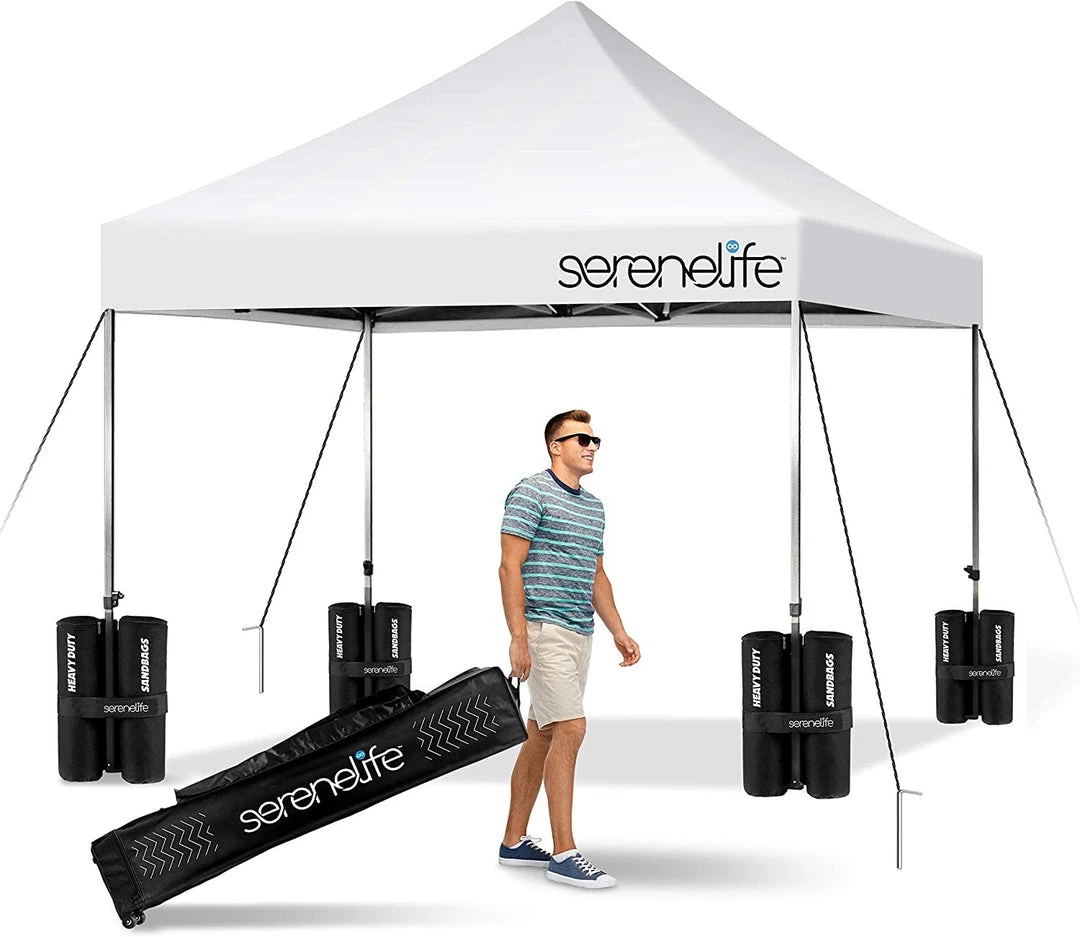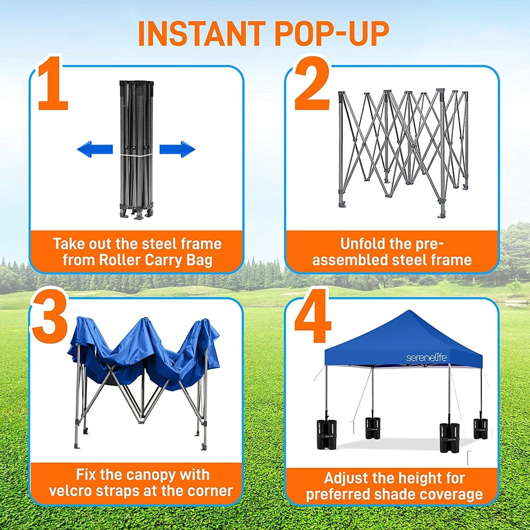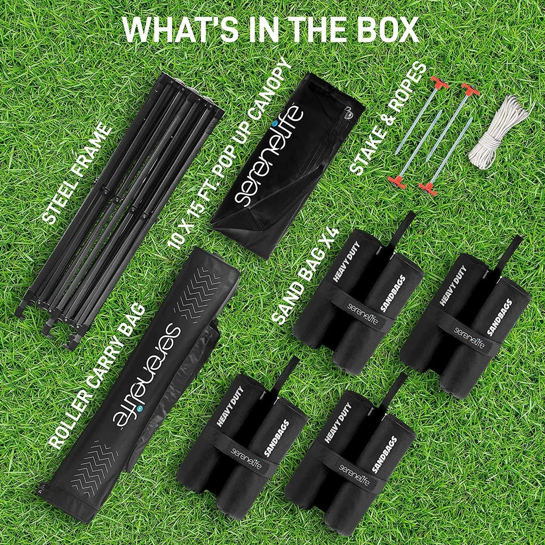 - 100 SQUARE FEET: SereneLife covered tent canopy has a total assembled size of (LxWxH) 120″ x 120″ x 133″ –inches and provides 100 square feet of shade and UV protection. Can cover 4 tables, 3 beach chairs and 10 people at the same time