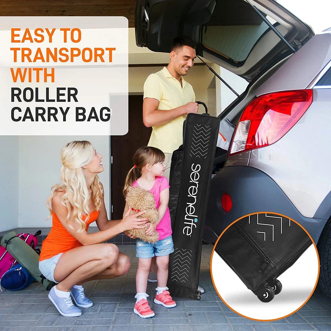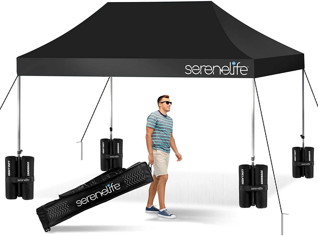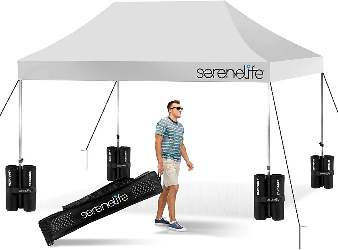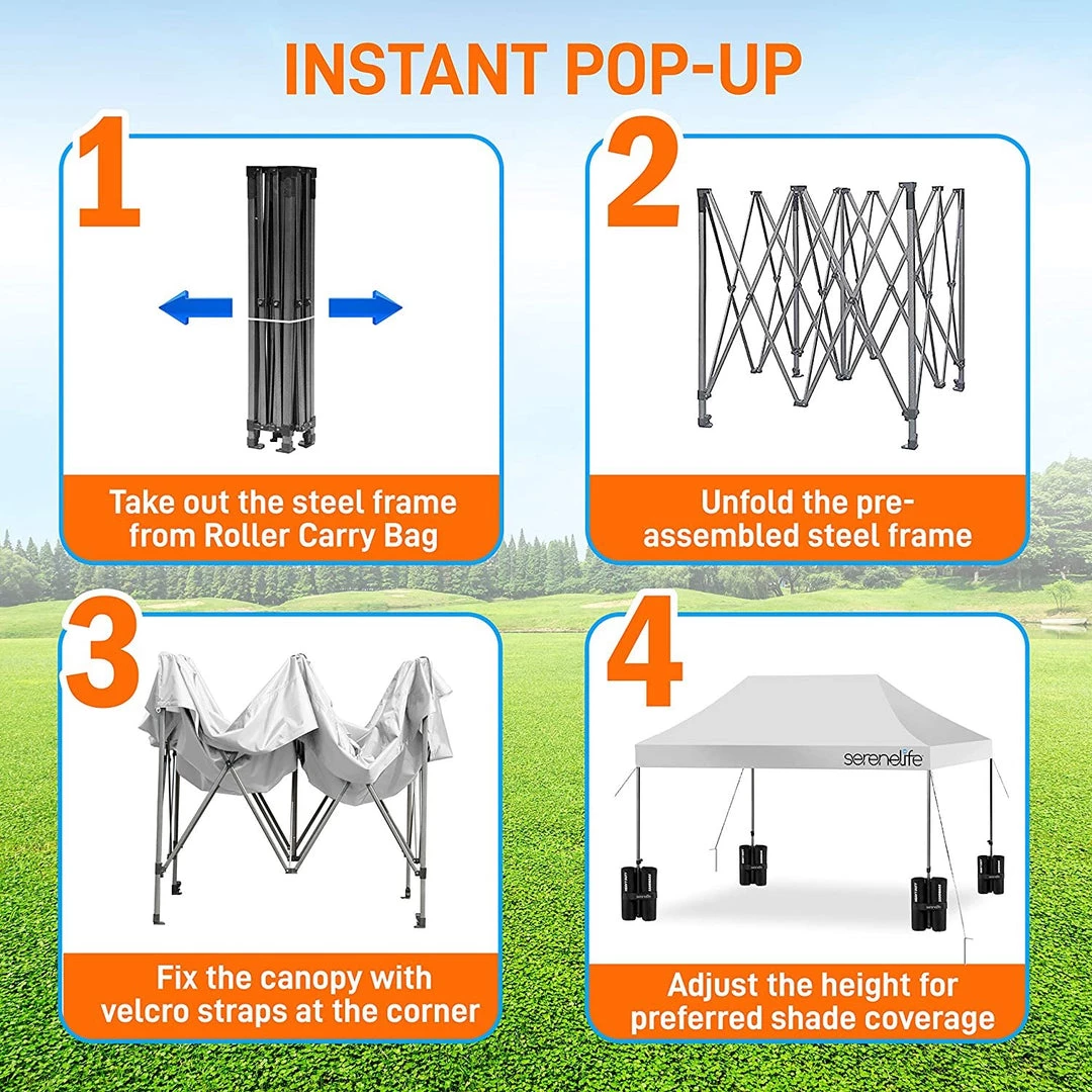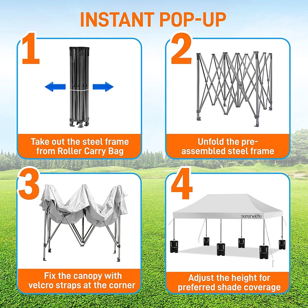 - 100 SQUARE FEET: SereneLife covered tent canopy has a total assembled size of (LxWxH) 120″ x 120″ x 133″ –inches and provides 100 square feet of shade and UV protection. Can cover 4 tables, 3 beach chairs and 10 people at the same time