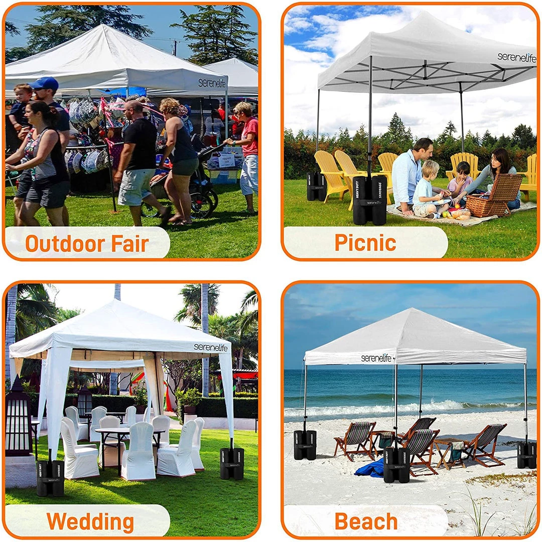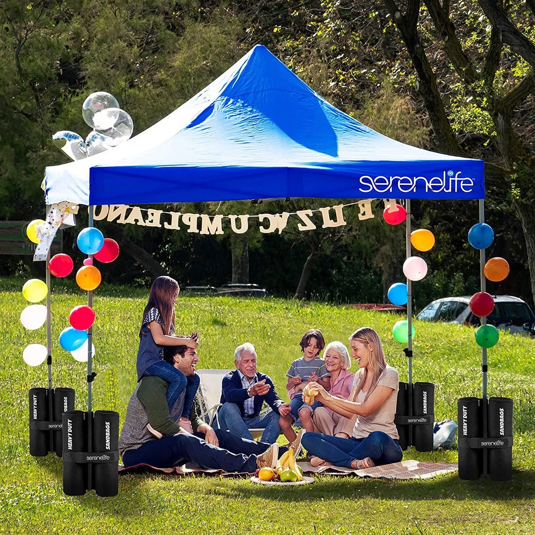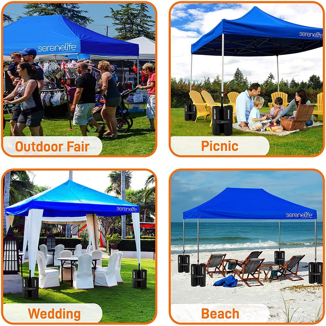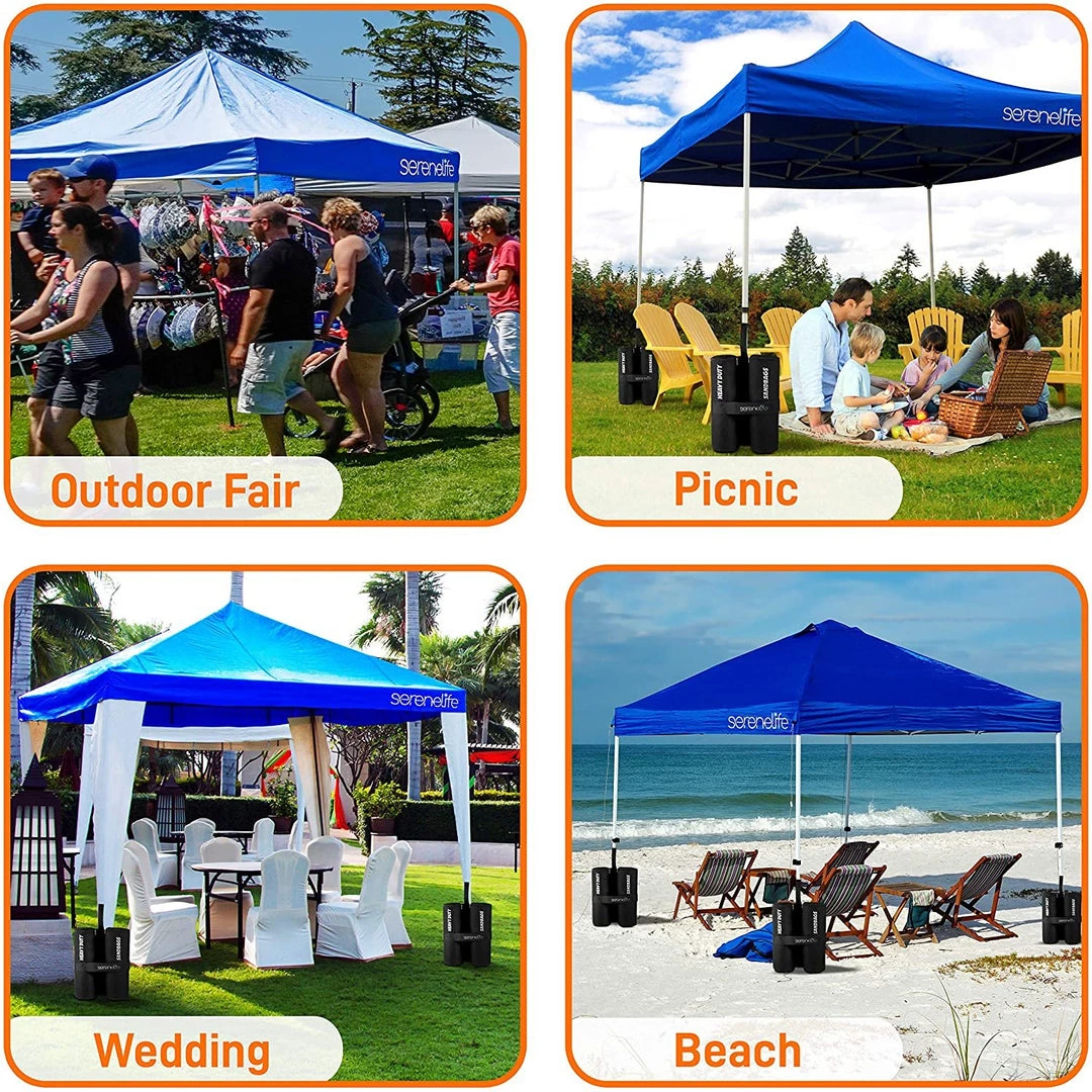- WHEELED CARRY BAG: This heavy duty canopy set comes w/ wheel roller carry bag for portability and easy storage, (4) 35 lb sandbag, & stake & ropes. Perfect for beach, camping, backyard party, picnic, garden wedding event, outdoor sport & more