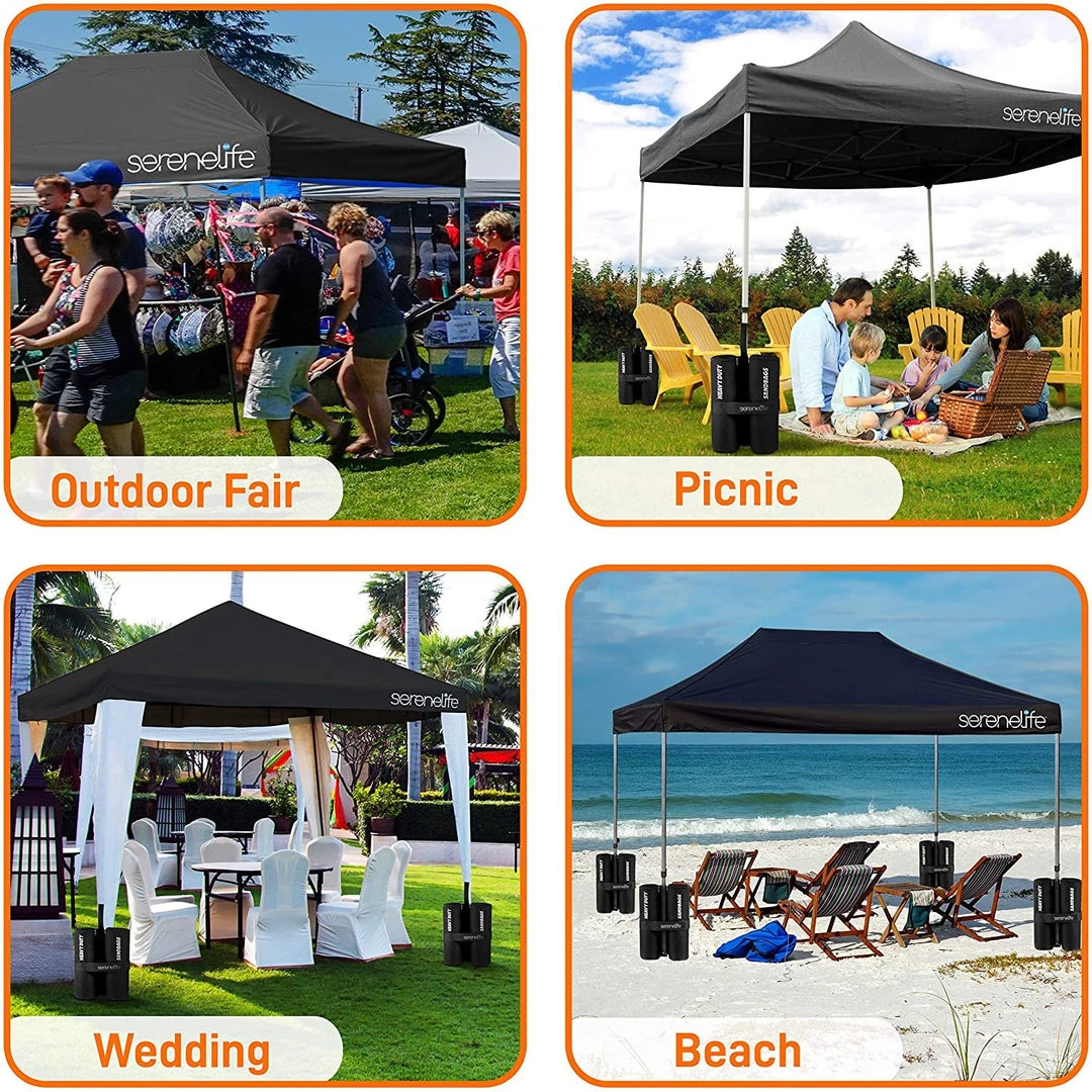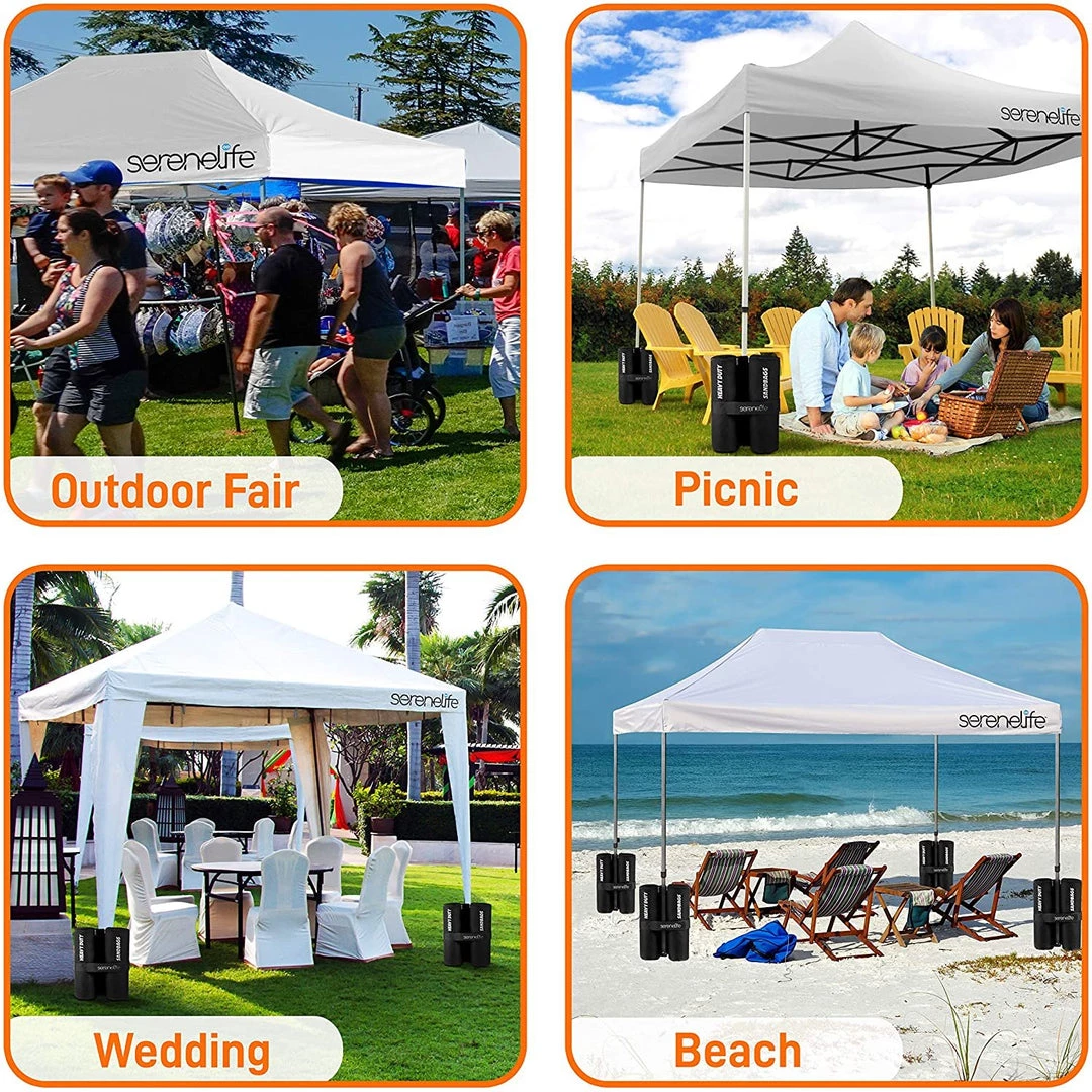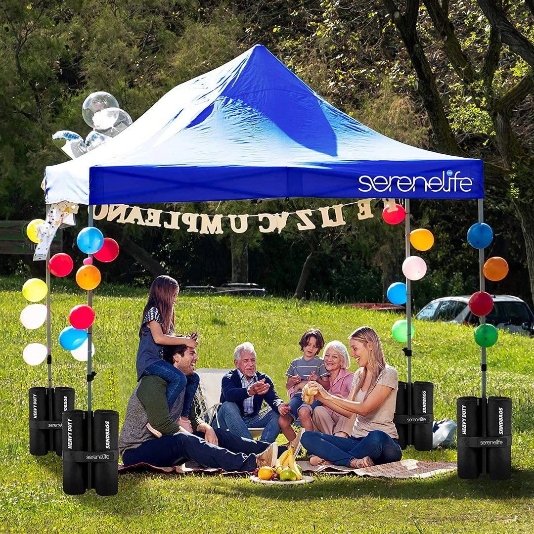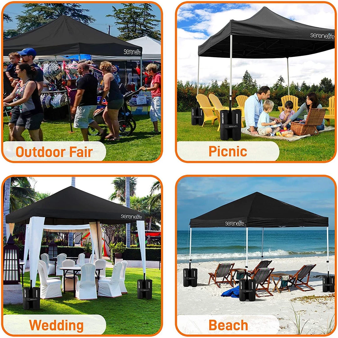 - WHEELED CARRY BAG: This heavy duty canopy set comes w/ wheel roller carry bag for portability and easy storage, (4) 35 lb sandbag, & stake & ropes. Perfect for beach, camping, backyard party, picnic, garden wedding event, outdoor sport & more