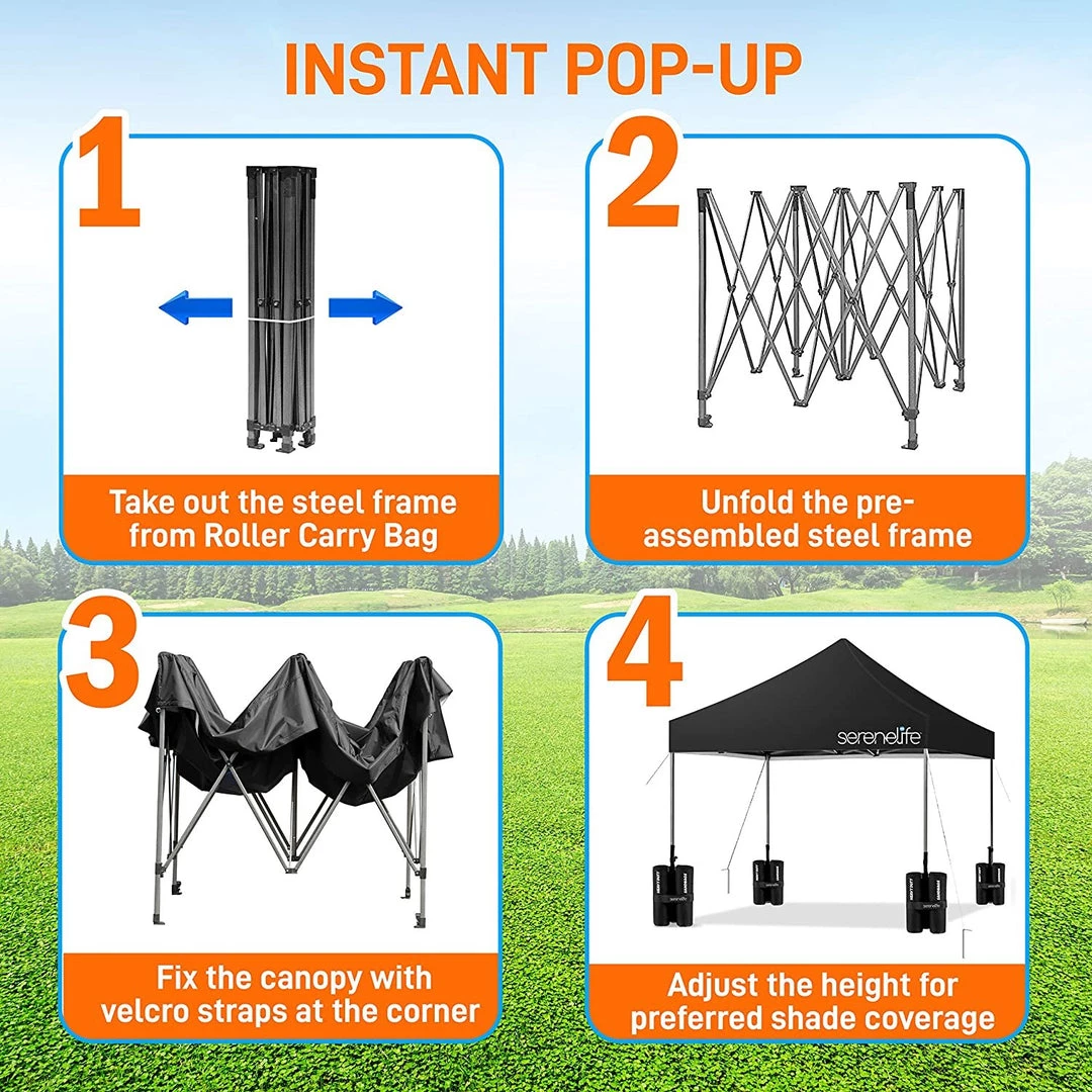 - EASY TO SET UP: The sport canopy collapsible shade tent instant canopy can be assembled by one person. It is equipped w/ push sliders, height adjustable push-button thumb lock leg extenders and highly-attached velcro to keep canopy stick on the frame
