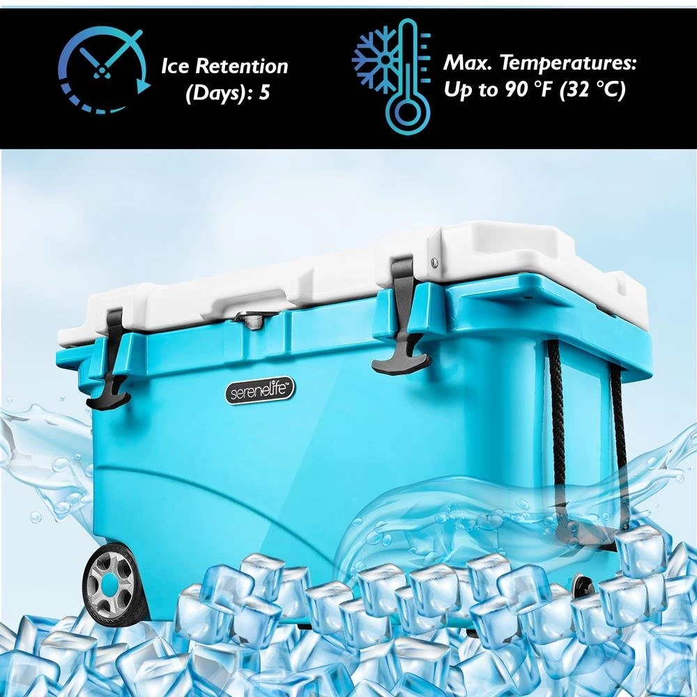 - 5 DAYS ICE RETENTION: The cooler with handle is constructed with thermomize insulation to keep food and beverages fresh and cold for a long period of time. Keeps ice up to 5 days at temperatures up to 90 °F (32 °C)