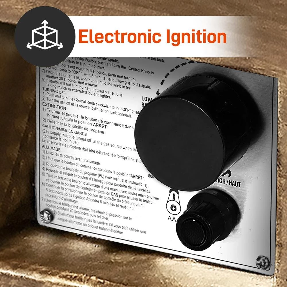 - COMPLETE SET: The square firepit propane fire table complete set includes 201 SS burner, copper injector, control knob, gas valve, igniter, corrugated pipe, thermocouple, fire pin with protective guard, PVC cover, lava rock, user manual