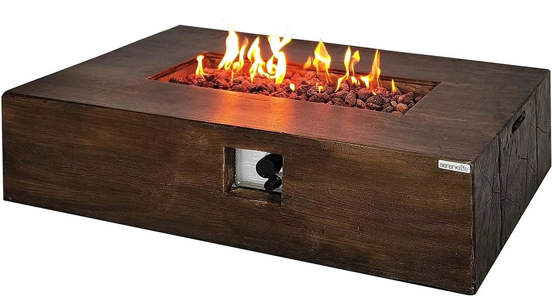 Features: – Not Convertible to Natural Gas – Assembled Gas Hose Regulator – Adjustable Flame Height by Valve Knob – Sturdy Metal Gas Fire Pit Table – Control Panel – 50,000 BTU Stainless Steel Burner – Constructs with Weather Resistant – Safe and ETL Certified and Approved – Decorative Lave Rock Set – Creates an Elegant Atmosphere in the Garden, Terrace, Balcony, or Backyard What’s in the Box: – 201 SS Burner – Copper Injector – Control Knob – Gas Valve – Igniter – Corrugated Pipe – Thermocouple – Fire Pin with Protective Guard – PVC Cover – Lava Rock – User manual Technical Specs: – Construction Material: MGO – Heat Output: 50,000 BTU – Regulator Valve with Gas Hose Length: 118.1” -inches – Primary Fuel Type: Liquid Propane – Propane Tank Weight: 20lbs. (Not Included) – Ignition Type: Pulse Ignition – Product Dimension (L x W x H): 54.33′ x 27.95” x 13.78′ -inches