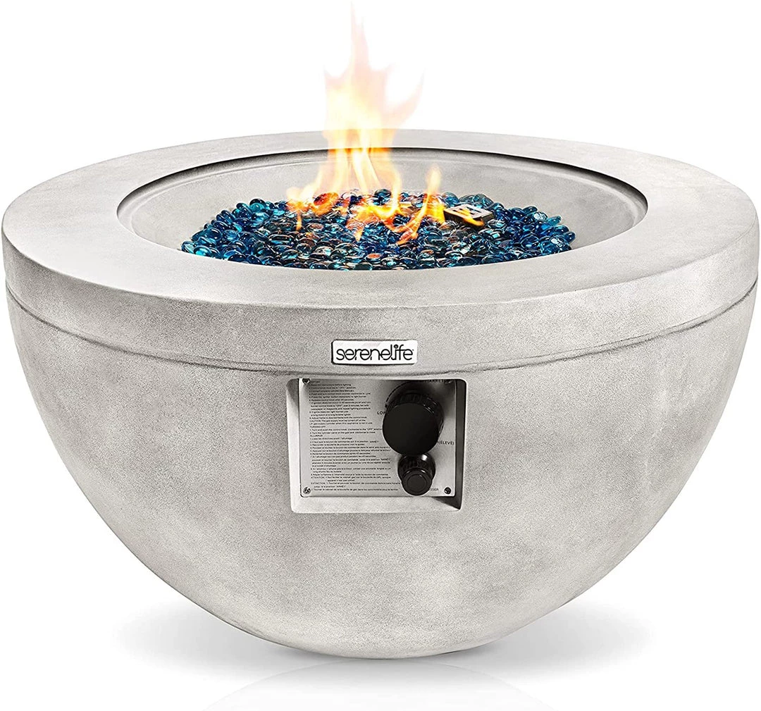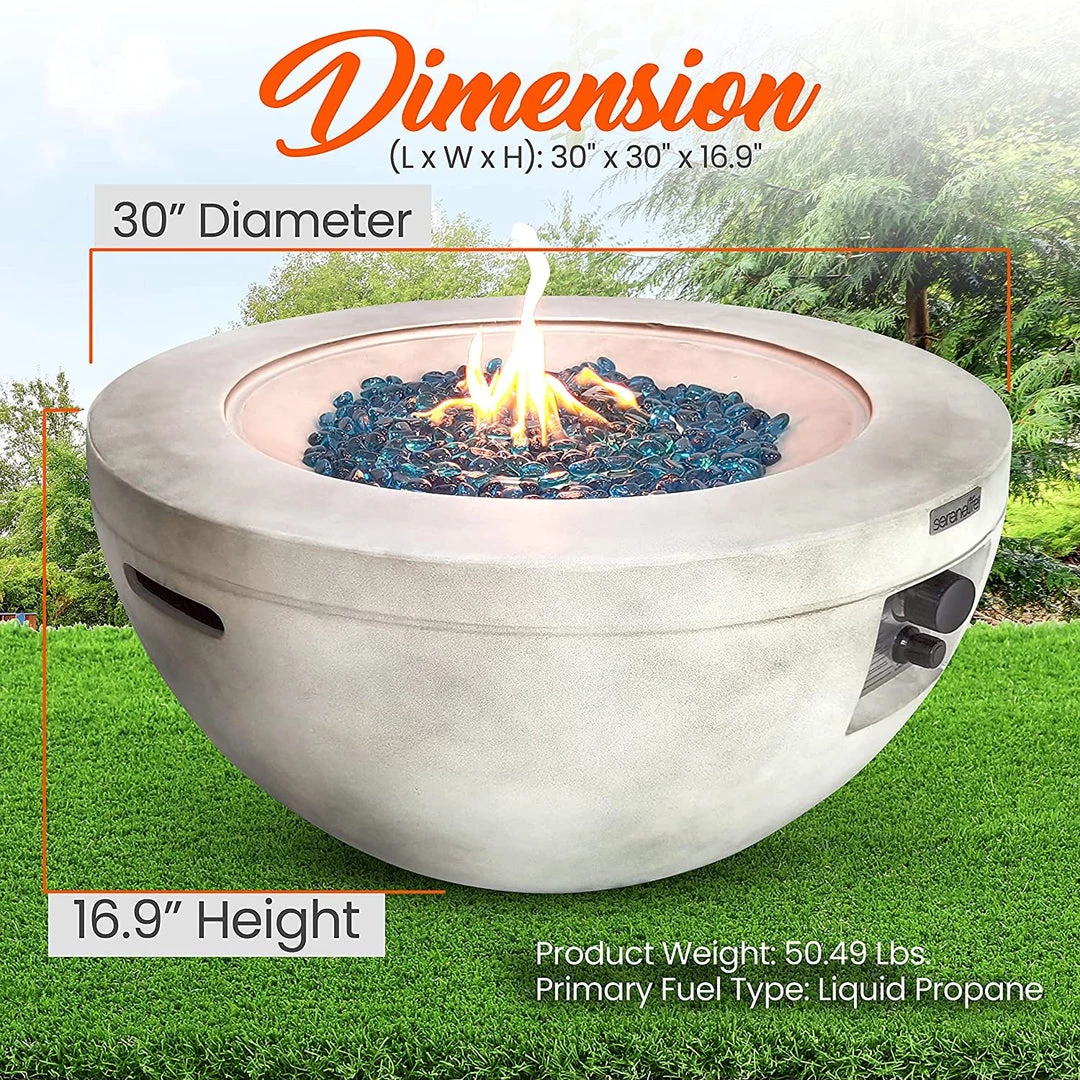Features: – Not Convertible to Natural Gas – Assembled Gas Hose Regulator – Adjustable Flame Height by Valve Knob – Sturdy Metal Gas Fire Pit Table – Control Panel – 40,000 BTU Stainless Steel Burner – Constructs with Weather Resistant – Safe and ETL Certified and Approved – Decorative Blue Glass Rock Set – Creates an Elegant Atmosphere in the Garden, Terrace, Balcony, or Backyard What’s in the Box: – 201 SS Burner – Copper Injector – Control Knob – Gas Valve – Igniter – Corrugated Pipe – Thermocouple – Fire Pin with Protective Guard – PVC Cover – Blue Glass Rocks – User manual Technical Specs: – Construction Material: MGO – Heat Output: 40,000 BTU – Regulator Valve with Gas Hose Length: 118.1” -inches (3000mm) – Primary Fuel Type: Liquid Propane – Propane Tank Weight: 20lbs. (Not Included) – Ignition Type: Pulse Ignition – Product Dimension (L x W x H): 30” x 30” x 16.9” -inches