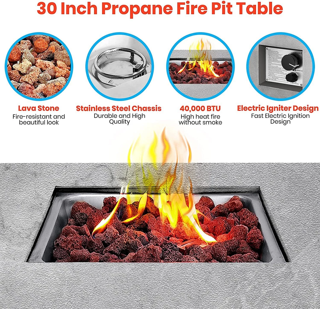 - COMPLETE SET: The square firepit propane fire table complete set includes 201 SS burner, copper injector, control knob, gas valve, igniter, corrugated pipe, thermocouple, fire pin with protective guard, PVC cover, lava rock, user manual