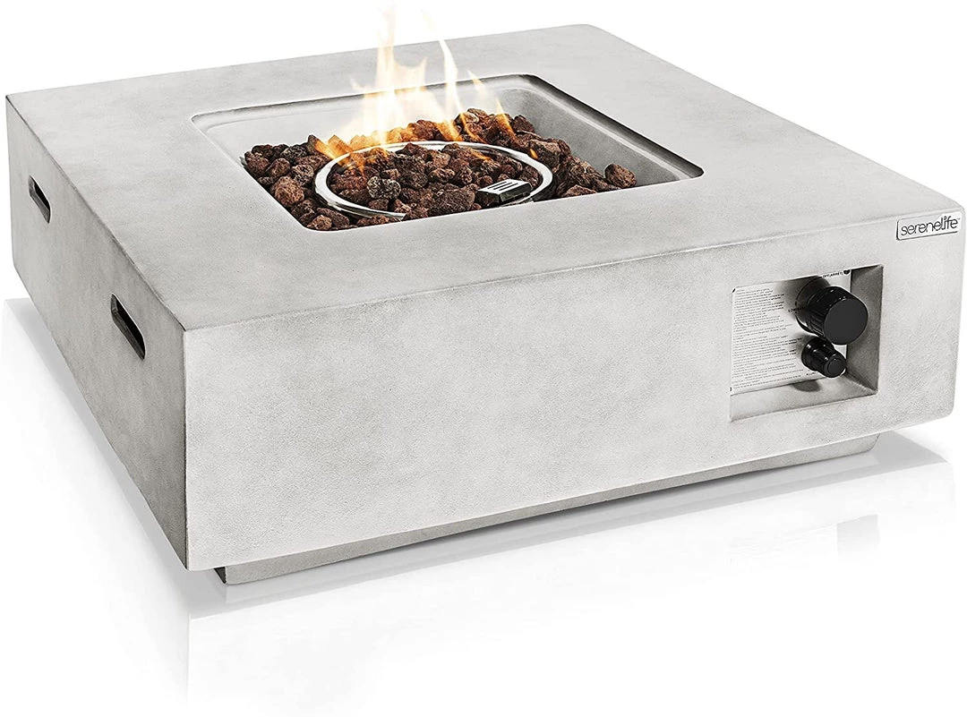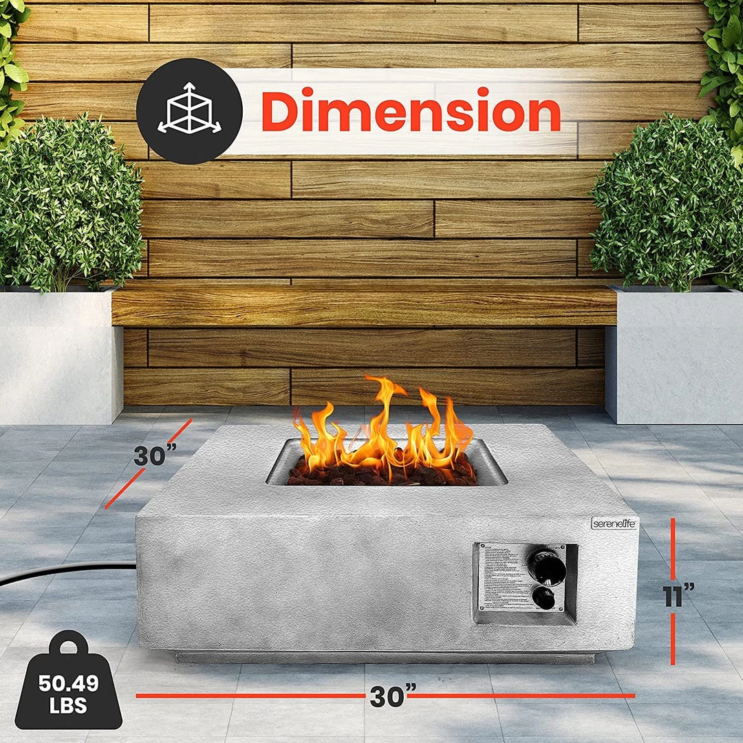 Features: – Not Convertible to Natural Gas – Assembled Gas Hose Regulator – Adjustable Flame Height by Valve Knob – Sturdy Metal Gas Fire Pit Table – Control Panel – 40,000 BTU Stainless Steel Burner – Constructs with Weather Resistant – Safe and CSA Certified and Approved – Decorative Lave Rock Set – Creates an Elegant Atmosphere in the Garden, Terrace, Balcony, or Backyard What’s in the Box: – 201 SS Burner – Copper Injector – Control Knob – Gas Valve – Igniter – Corrugated Pipe – Thermocouple – Fire Pin with Protective Guard – PVC Cover – Lava Rock Technical Specs: – Construction Material: MGO – Heat Output: 40,000 BTU – Regulator Valve with Gas Hose Length: 118.1” -inches – Primary Fuel Type: Liquid Propane – Propane Tank Weight: 20lbs. (Not Included) – Ignition Type: Pulse Ignition – Product Dimension (L x W x H): 30” x 30” x 11” -inches