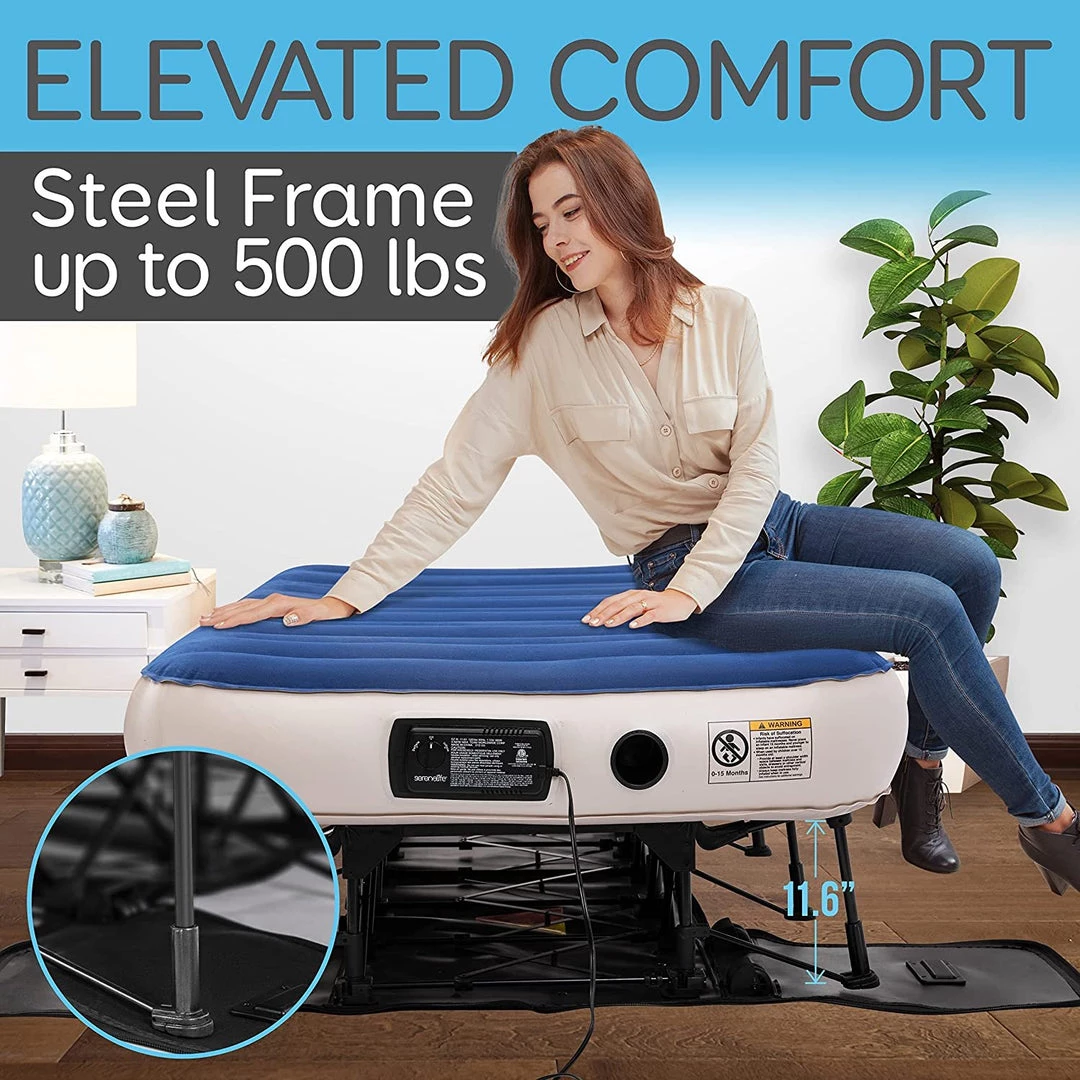 Great Spare Bed for Out-Of-Town Guests, Soft, Plush Flocking Material Helps Keep Sheets in Place, Sturdy PVC Mattress, High Output Pump Power Inflate and Deflate Under 3 Minutes, Raised 20″ From the Floor, Built-in AC Operated Pump, Enhanced Coil Technology, Automatically Opens and Closes by Itself, Raised Height like Regular Bed, Powder Coated Steel Frame, Sturdy, 600-Denier Polyester Wheeled Storage Case, Automatically Inflates and Deflates, Flocked-Top Surface Keeps Bedding in Place, Multiple Patents Design, Airbed With Steel Frame, Electric Pump, (2) Repair Patch with Adhesive, Built-in Zip Storage Bag (or Wheeled Case), Material: Sturdy PVC & flock top, PVC Thickness: 0.45mm, Coil: Elongate and I Beam, Weight Capacity: 300 lbs., Case Dimensions: 24″ x 16″ x 20″ -inches Inflated Dimensions: 77″ x 40″ x 20.25″ -inches, Weight: 44.97 lbs.
