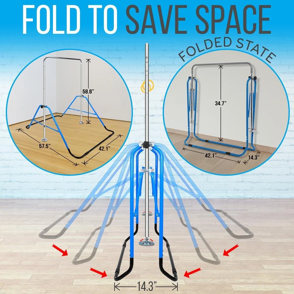 - FOLDING SPACE SAVER: Gymnastic bar set legs fold in and lock to save space. Monkey bars go from 58” width to 14.2”. Fits over standard gym mat
