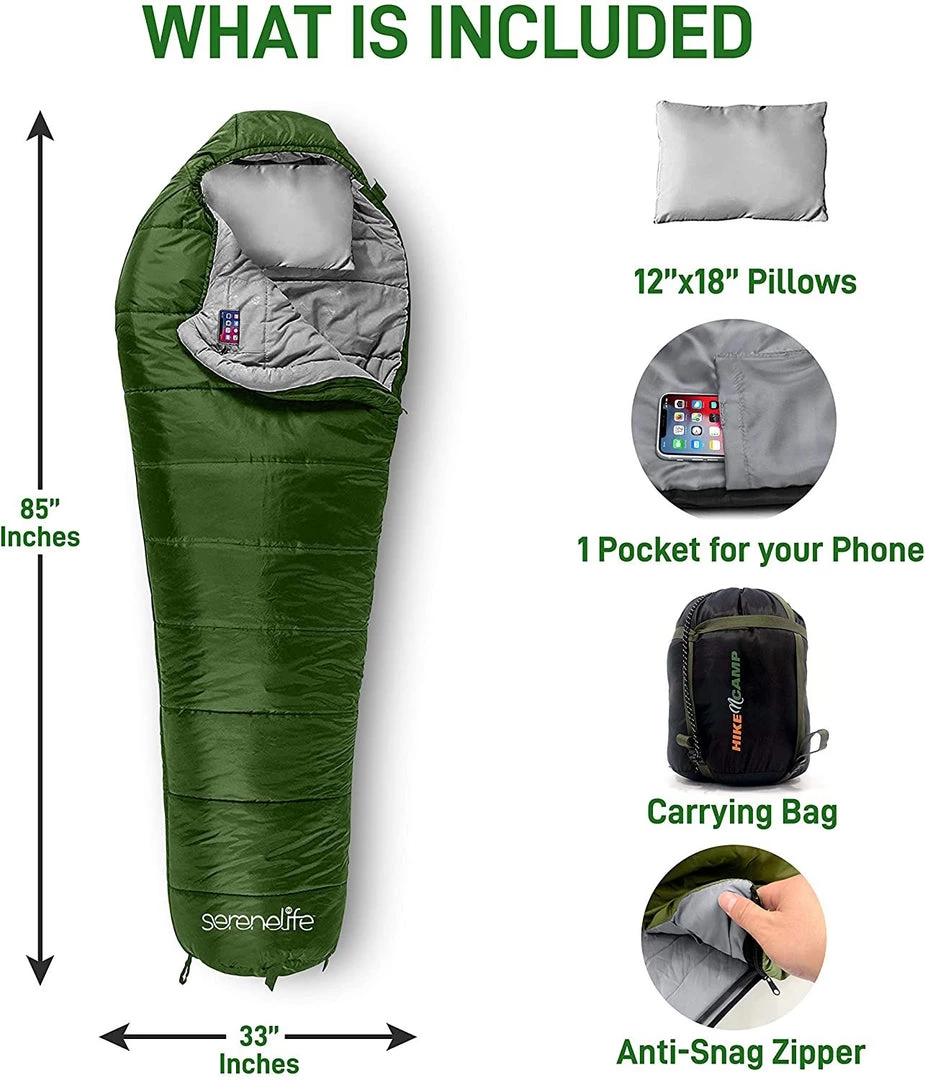 Features: – Portable and Lightweight – Soft 210 Thread Count – Anti-Snag Zipper – Opens on One Side – Designed for Extreme Weathers – Sturdy and Waterproof Outer Liner – High-Quality Materials, Great for Hiking – Easy to Clean, Warm, Comfortable and Washable – Compact Size with a Compression Backpack – Perfect for Camping, Backpacking, Hiking, Traveling and More – Designed for Couple, Family, Adults, and Teens – Includes One Compact Compression Sack – 1 Pocket for your Phone What’s In The Box: – (1) Mummy Sleeping Bag – (1) Carrying Bag – (1) Pillows Technical Specs: – Temperature Rate: 5-10° Fahrenheit – Construction Material: Fabric: 210T Polyester, Liner: Soft Pongee, Filling: 2 X 0.48 lbs. Double Layers Filling Hollow Cotton – Pillows Size: 12.2’’ x 18.1’’ -inches – Product Dimension: Rectangular Style: 86.6” x 33.5” x 23.6’’ -inches