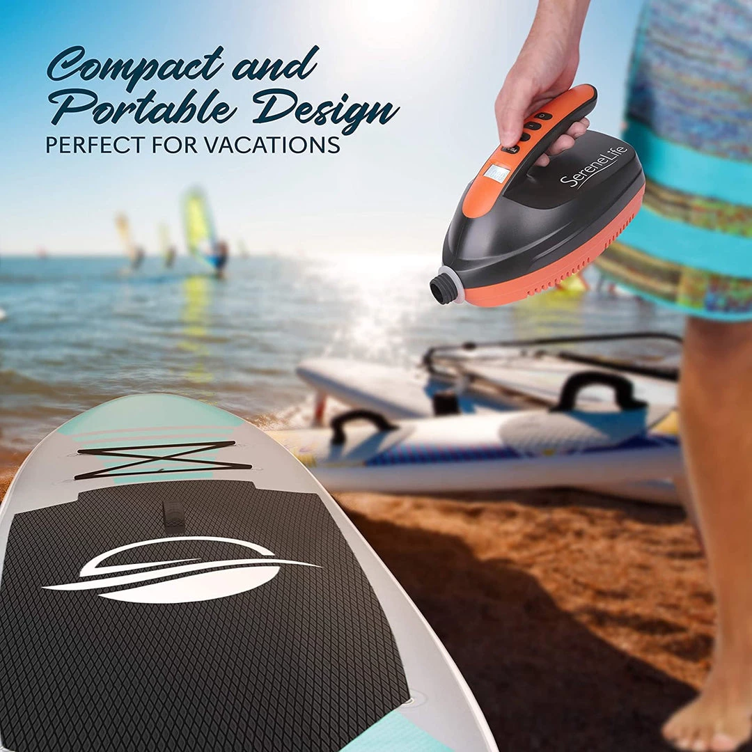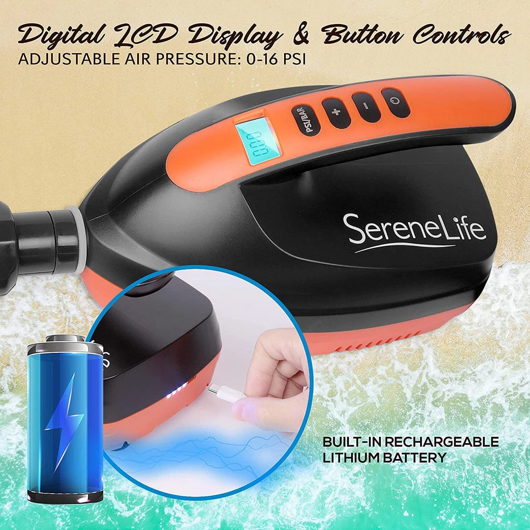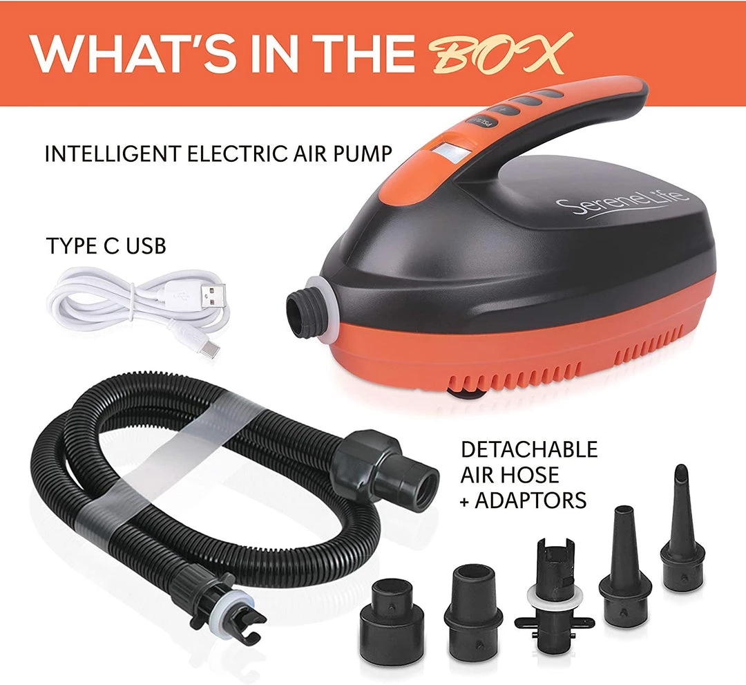 Features: – Intelligent Electric Air Pump for Stand Up Paddle-boards & Water Sports Inflatable Pool, etc. – Compact and Portable Design – Simple and Hassle-free Operation – Digital LCD Display & Button Controls – Adjustable PSI (Pounds per Square Inch) Air Pressure Settings – Built-in Rechargeable Lithium Battery – Powerful Inflator for both Indoor and Outdoor Use What’s in the Box: – Air Pump – Detachable Air Hose – Type C USB Cable Technical Specs: – Power Output: 110 Watt – USB Power: DC 5V 2A – Adjustable Air Pressure: 0-16 PSI – Air Hose Length: 3.3′ ft. – USB Cable Length: 3.3′ ft. – Charging Time: 8 Hours – Battery Type: 18650 Lithium Battery, 4000 mAh – Product Dimension (L x W x H): 9.1” x 5.5” x 4.7” -inches