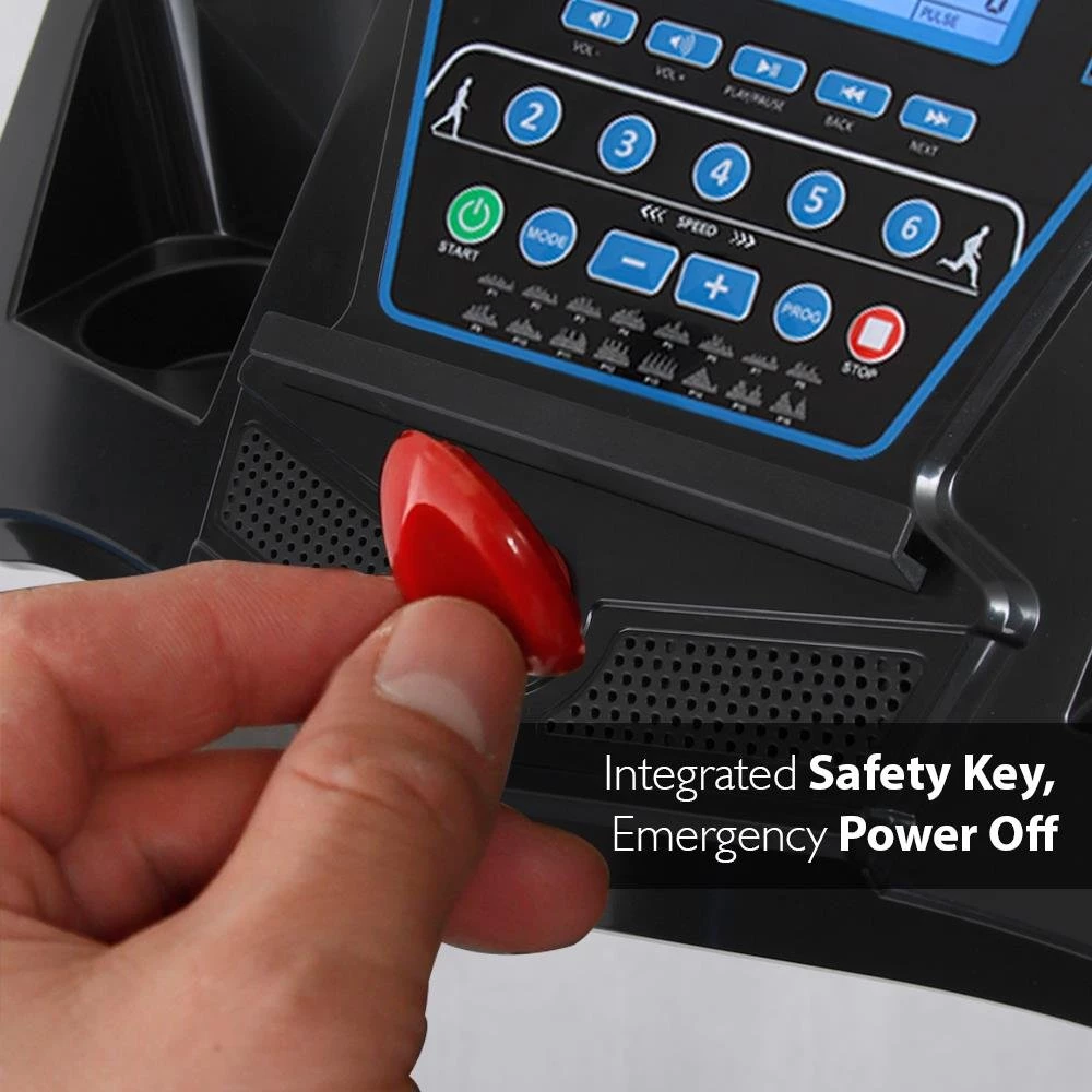 - SAFE TO USE: Stay safe & get an effective workout with this foldable treadmill. It comes with integrated safety key & emergency shut-off button to cut power instantly. Perfect for jogging, walking, running & cardio workout at home