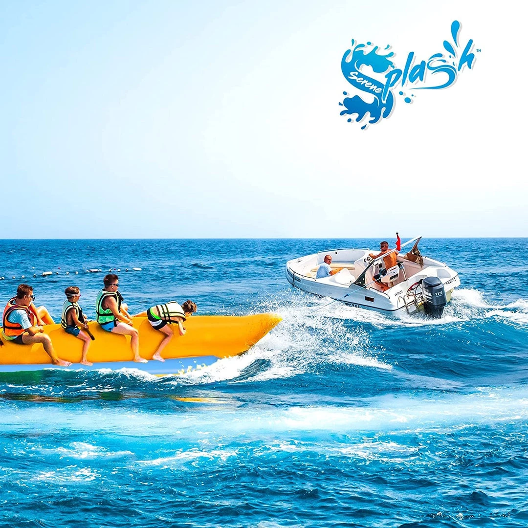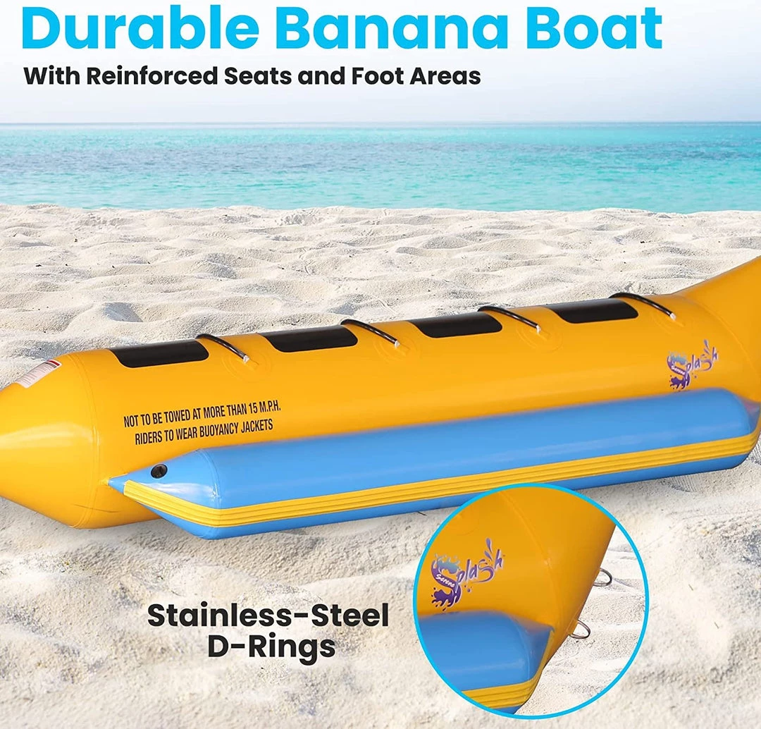 - ENSURES LONGEVITY WITH REINFORCED PVC: This inflated banana boat is made from 0.9mm mesh reinforced PVC construction and has reinforced seats and foot areas. It also comes with a free repair kit. This banana boat has a weight of 680 lbs