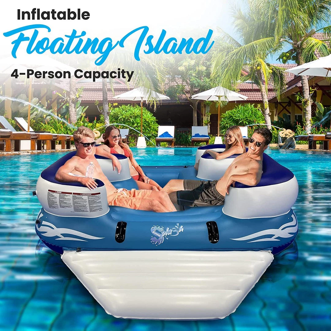 Features: – Heavy Duty PVC for Durability – Quick Release Safety Valve – 4-Person Capacity – 4 Built-in Cupholders – Inflatable Seats with Backrests Provide Comfortable Seating – Spacious and Wide Seats – Paired with Supportive Backrests and Armrests – Includes Grip Handles and Rope Holder – Inflates and Deflates in a Minutes with the Help of Quick Release Valves – Perfect for Sunbathing or Lounging on the Lake, Beach, River, or Pool What’s in the Box: – (1) Inflatable Float – (4) Cup Holders – (6) Grip Handles – (5) Quick Release Valves – (1) Anchor Bag with Rope – (1) Rope Holder – (1) Repair Patch – (1) PE Storage bag Technical Specs: – Construction Materials: 0.6mm PVC – Occupancy: Accommodates up to 4 Adults – Maximum Weight Capacity: 705 lbs. (319 kg) – Inflated Product Dimensions: 28” x 95” x 129” -inches (Including the Landing Board)