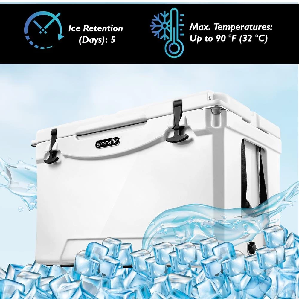 - 5 DAYS ICE RETENTION: The cooler with handle is constructed with thermomize insulation to keep food and beverages fresh and cold for a long period of time. Keeps ice up to 5 days at temperatures up to 90 °F (32 °C)