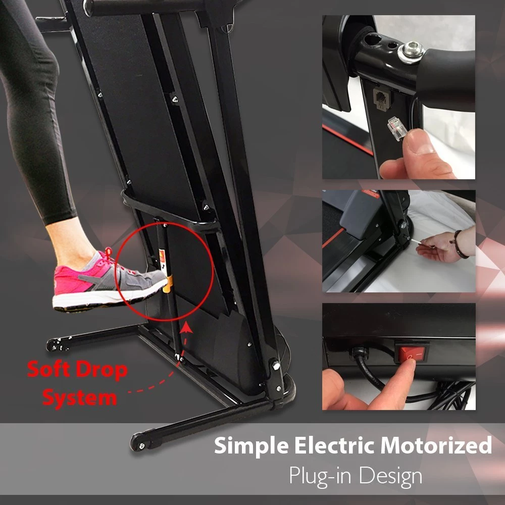 - CONVENIENT FOLDING STYLE: This treadmill is portable & foldable for easy setup & storage. It comes with simple electric plug-in design, motorized treadmill power of 1HP, built-in grip sensors for pulse monitoring & adjustable speed up to 6mph
