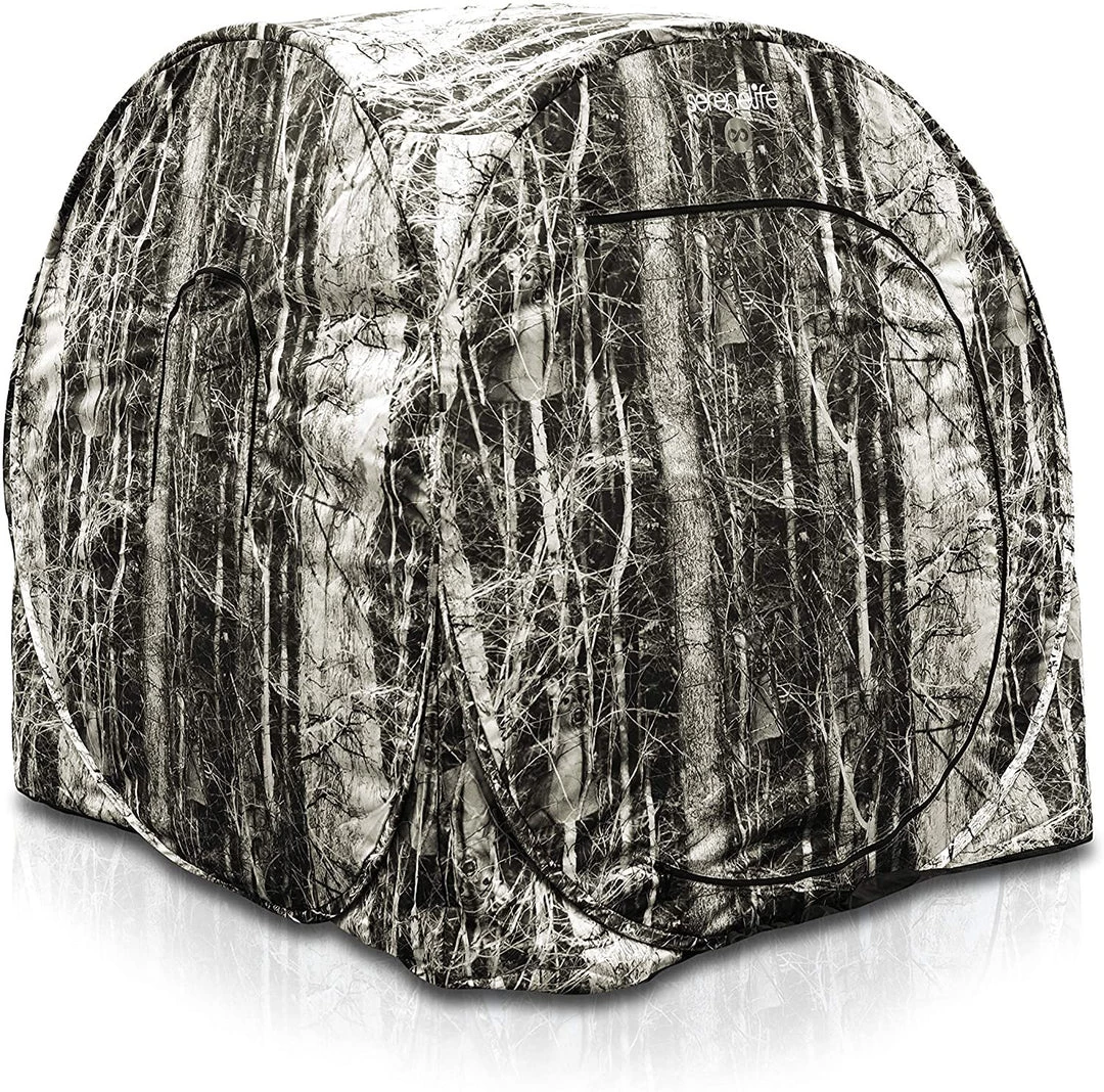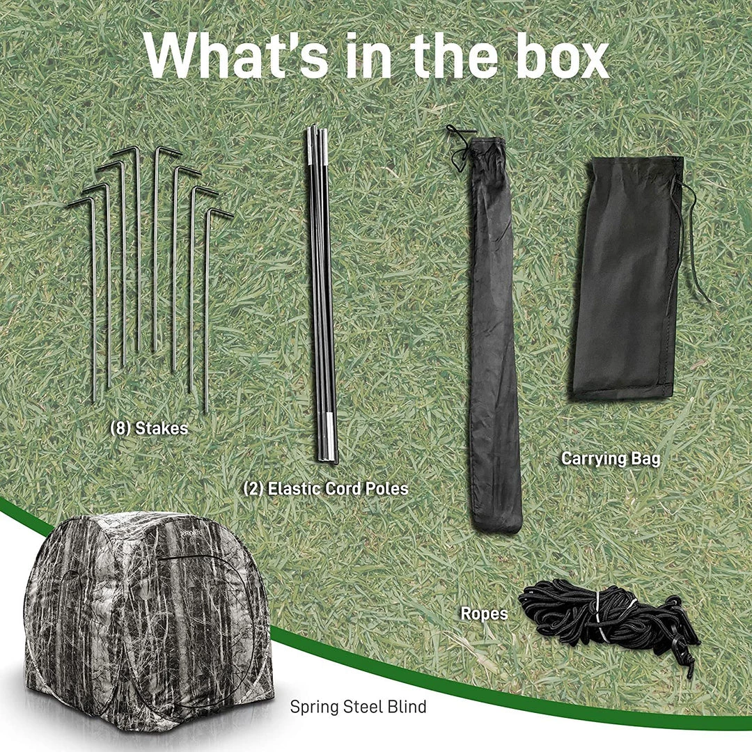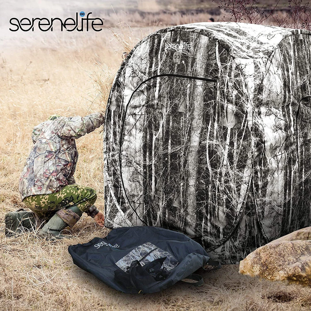 - STURDY & LIGHTWEIGHT: SereneLife portable hunting blinds are built tough and designed to withstand the most inclement weather conditions you dare to be caught in; rain, snow, hail, wind. Includes carrying bag, 4 ropes, 8 stakes & 2 elastic cord poles