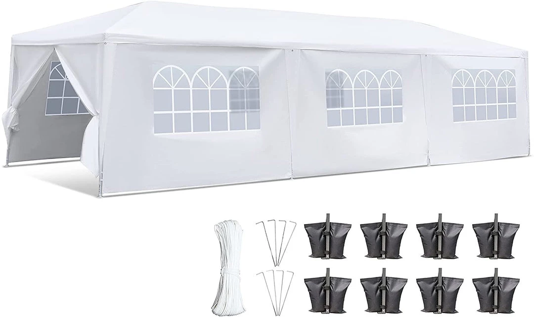 Features: – An Assembled Tent, Consist of Necessary Accessories – High-class PE Cloth Top and Iron Tube windproof – With Outstanding Waterproof Performance – Large Space for Accommodating Many People and Stuff – Spiral Interface between the Tubes makes Overall Frame more Stable – Center Stable Protection – Highly-Attached Velcro to Keep Canopy Stick on the Frame – Heavy-Duty Fabric; Covers 4 Tables, 3 Beach Chairs, and 10 People at the Same Time – 100% Waterproof and Weatherproof Roof – Suitable for Sunny and Rainy Seasons – Easy to Set Up, Portable and Lightweight for Transportation – Sturdy Wheels for Easy Portability – Heavy-Duty Wheels with 8 Sand Bags, 8 Stakes & Ropes for Stable Use – Perfect Tent for Outdoor Sports, Parties Events, Festivals and more Sand Bags Features: – Double Stitched for Durability – Waterproof and Weatherproof – Two Velcros Sewed on the Bag – Quick and Easy to Fill with Sand – Stabilize any Instant Canopy, Pop Up canopy, or Folding Gazebo Structures – Used for Camping Sun Shelters, Sports Umbrella with a Set of Durable Universal Weight Bags Rope and Stakes Features: – 4mm Diameter Heavy-Duty Steel Rod – With Galvanized Finish for Superior Rust-Resistance – Rugged Design with Large No-Slip Hook – Lightweight Strength, Each Peg Weighs just 1 Ounce – Perfect for Anchoring Tents, Canopies, and more – Rope Length: 118” -inches – Stakes Length: 5.5” -inches What’s in the Box: – (1) 10 x 30 ft. Pop Up Canopy – (8) Sand Bag – (8) Stake & Ropes Construction Material: – 100g PE(Top), White powder-coated Steel (Frame) Technical Specs: – Eave size: 114.2’’ x 350.4’’ -inches – Base size: 118.1’’ x 354.3’’ -inches – Center Height: 98.4’’ -inches – Steel tube: 1.22’’ x 0.02’’/0.94’’ x 0.02’’/0.71’’ x 0.02’’ -inches – Connectors: PP – Windows Doorway Size: 66.93’’ x 35.43’’ -inches – Product Dimensions (L x W x H): 354’’ x 118’’ x 98’’ -inches