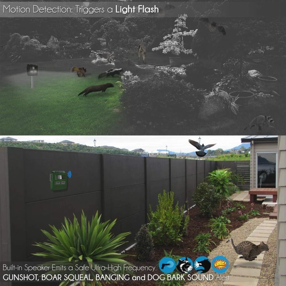 - MOTION DETECTION: The solar pest repeller works via motion detection triggers than emit a safe ultrahigh ultrasonic alert and light flash that repels several small pests, from birds to rodents.